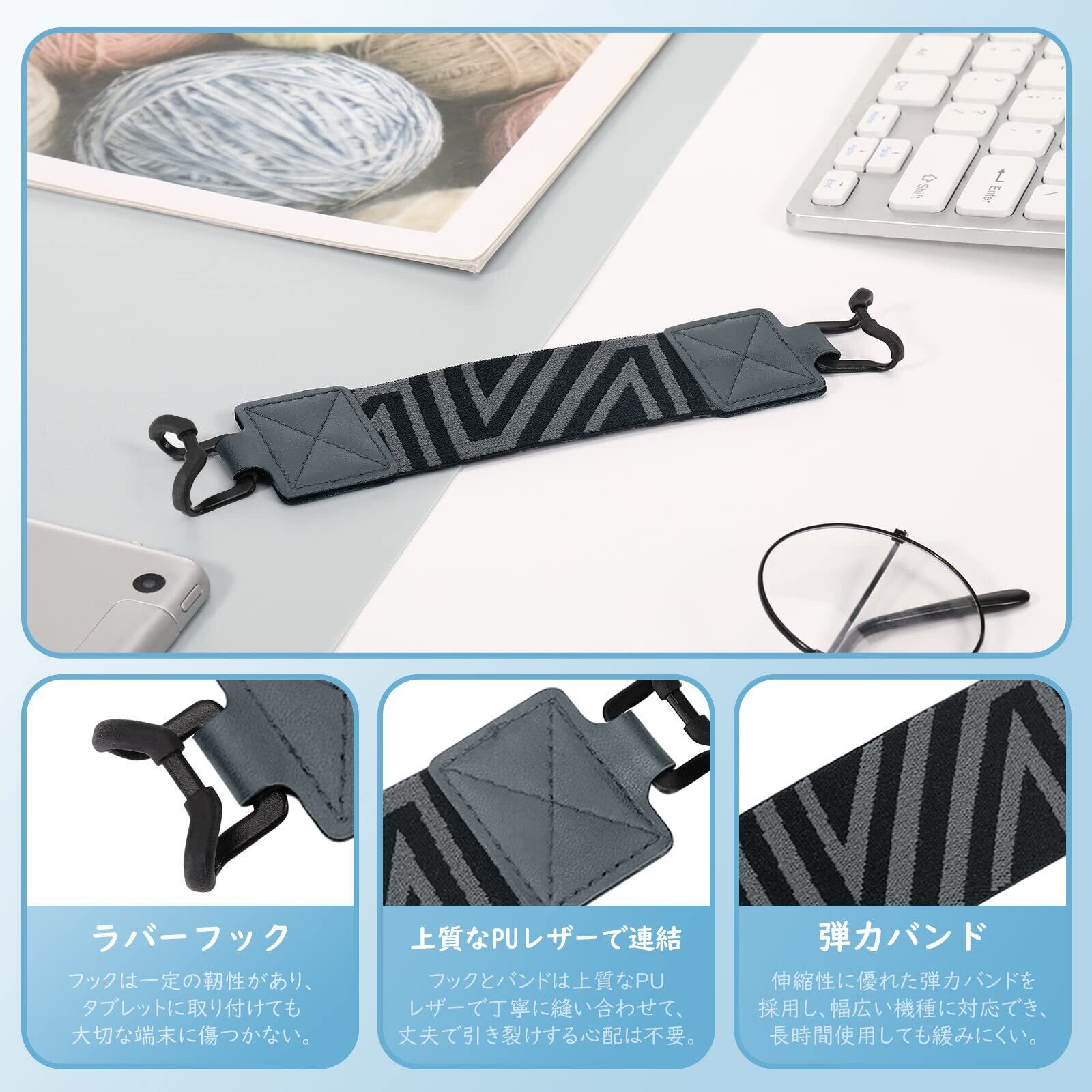 「上質素材採用」 優れた伸縮性がある弾力バンドを採用し、幅広い機種に対応でき、長時間使用しても緩みにくいです。上質なPUレザーを使用してフックの部分と丁寧に縫い合わせて、丈夫で引き裂けする心配は不要です。フックの部分はお客様のご意見を元に改良し、ラバー+シリコンの素材を採用し、タブレットに取り付けても大切な端末に傷つきませんし、滑り止め性能をより一層高め、安心してご利用いただけます。