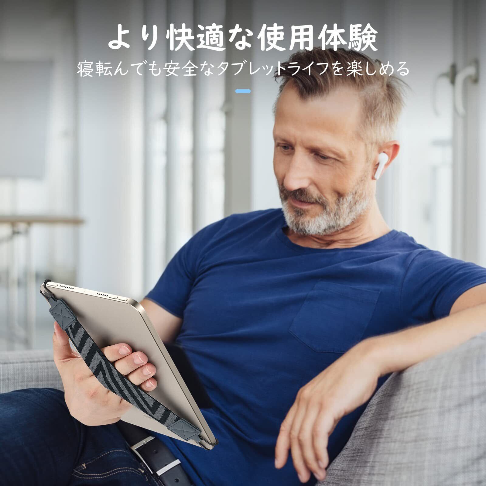 「片手持ち便利アイテム」 長時間タブレットを持っていると重く感じて手が疲れますが、このアイテムがあれば、タブレットの重量を手の全体、更に手首まで分散でき、より快適にタブレットを使えます。使用中手の疲れを分散でき、うっかりして落下するリスクも防げます。