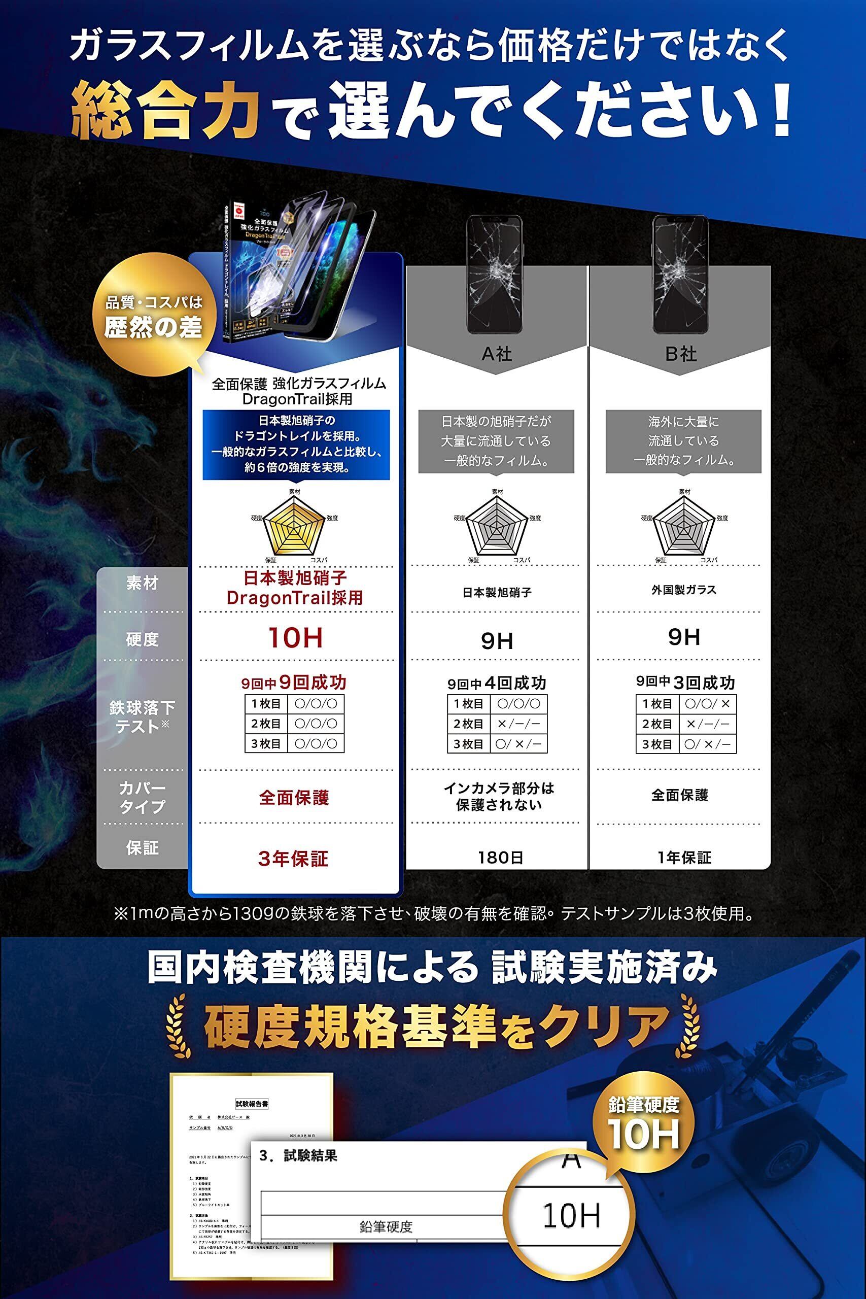 【 信頼度の高いジャパンクオリティ 日本製 旭硝子採用 】 TEIQ の ガラスフィルム は 外国製ガラスにありがちな粗悪なガラス ではなく、品質グレードAAAの『高品質』の日本メーカー 旭硝子製の硬度 10H の 強化ガラスフィルム を採用しています。 透過率は『90%以上』と何もつけていない状態と間違うほどの透明感を実現。 さらに、指紋や汚れの防止にもなるコーティングを施し、滑らかな表面となっているので汚れから守りながらもより良い操作性を実現した 液晶保護フィルム です。