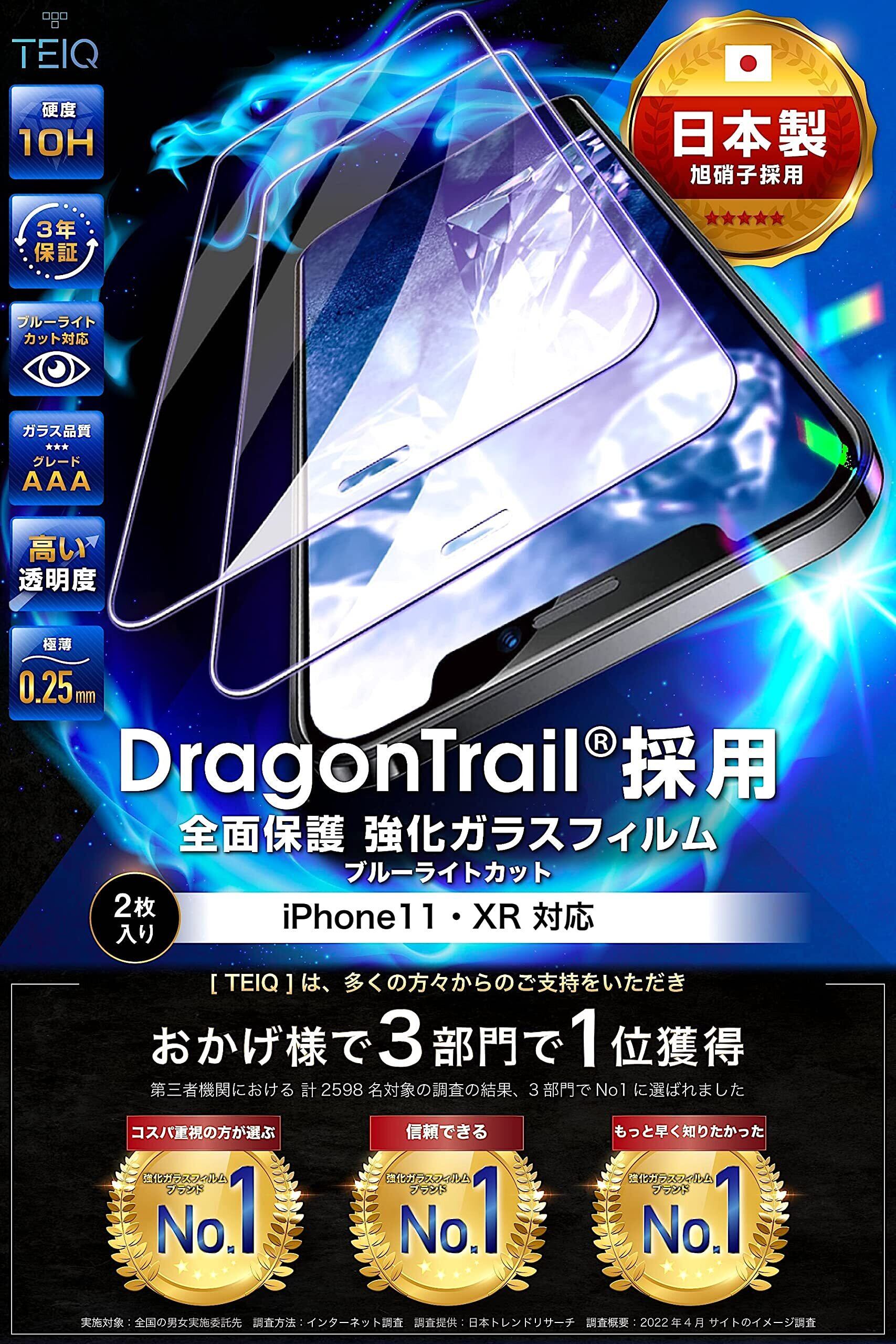 TEIQ ドラゴントレイル ガラスフィルム ブルーライトカット iPhone11 iPhoneXR 硬度10H 日本製旭硝子 全面保護 フィルム ガイド枠付き 2枚セット iPhone 11 / XR 用 GFDT-BLC-03