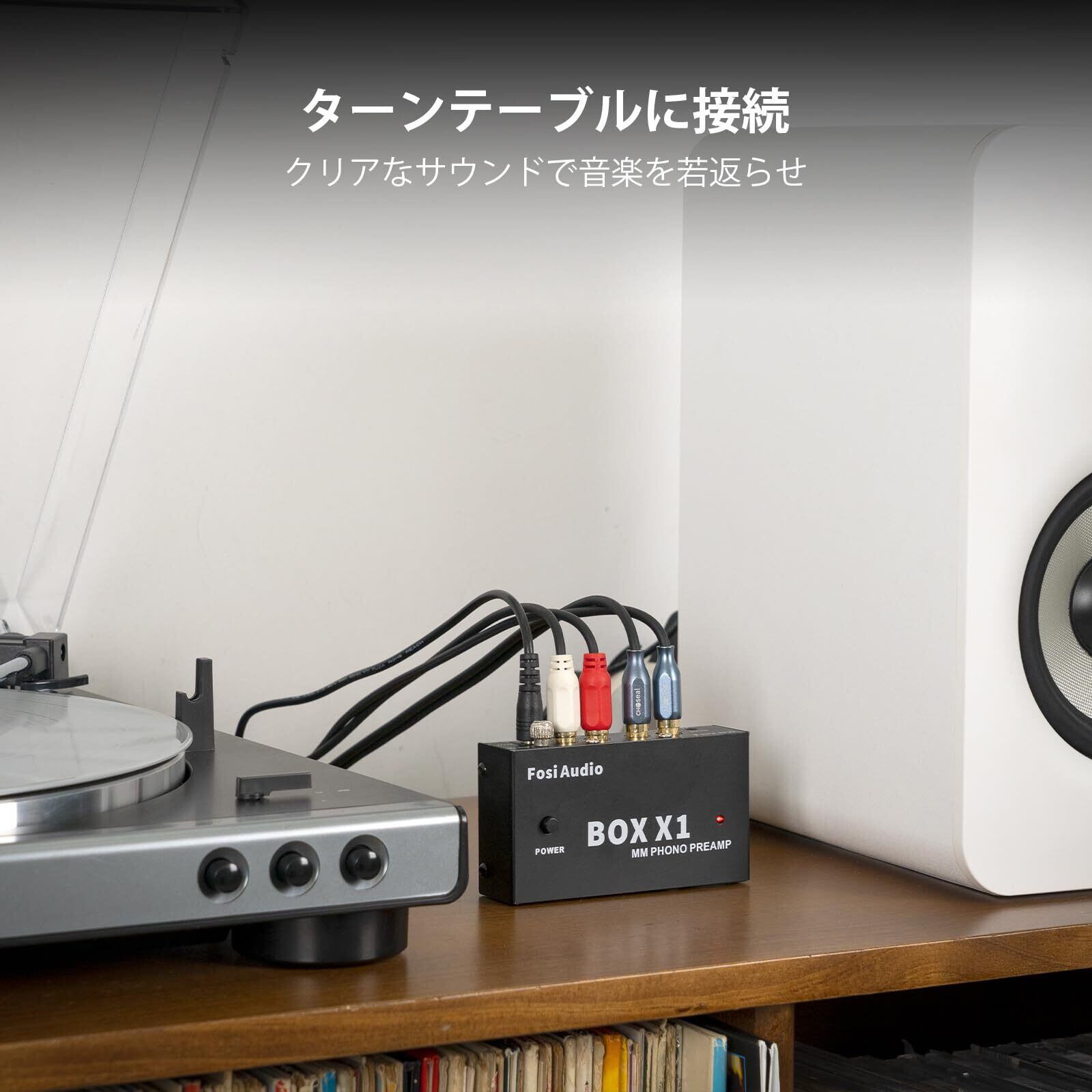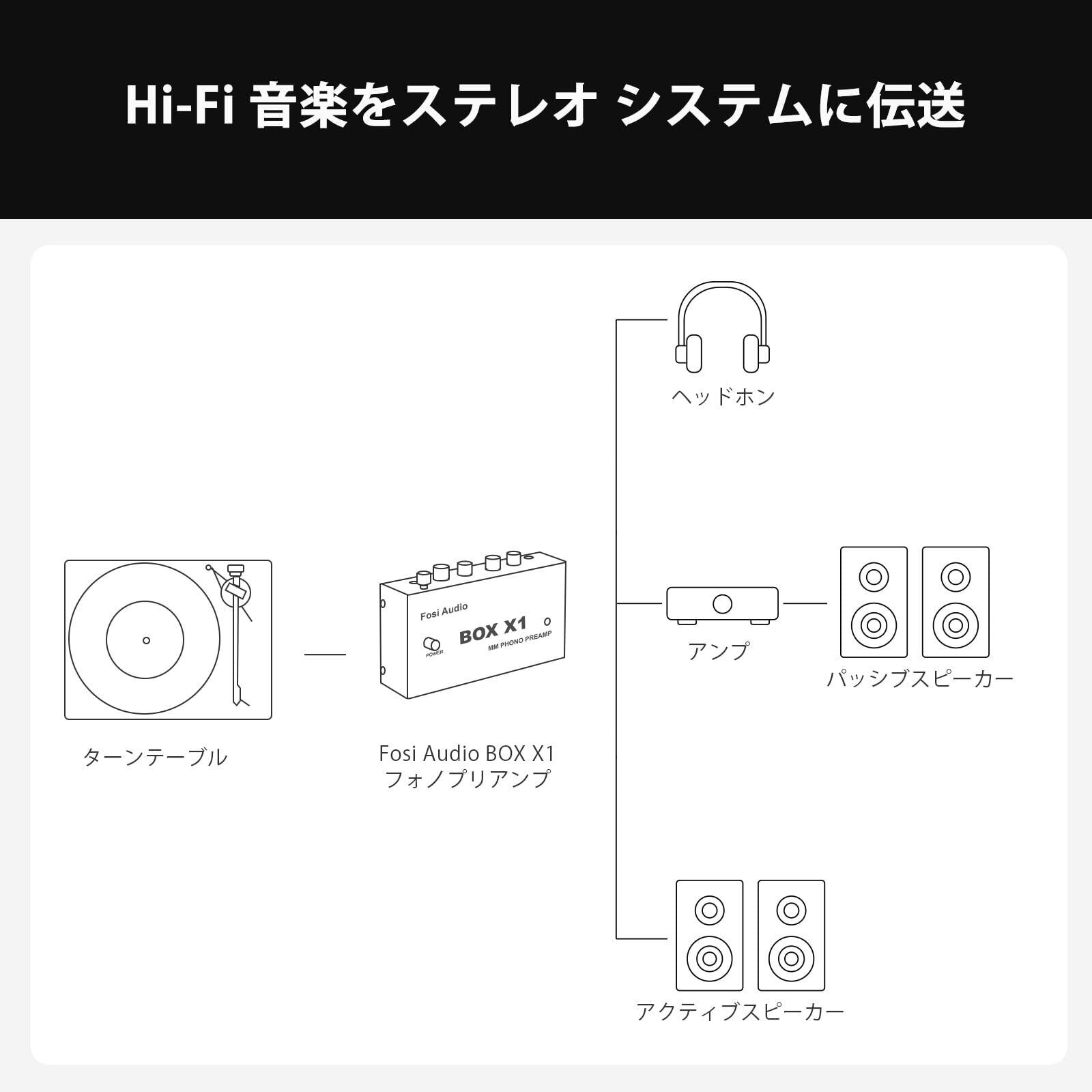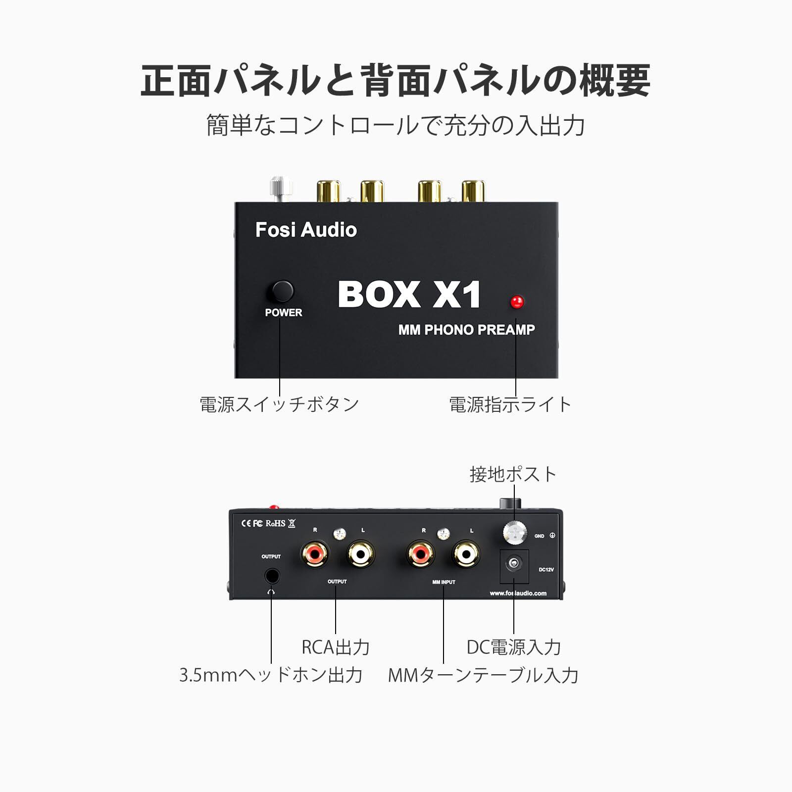 Fosi Audio BOX X1 フォノ プリアンプ MM ポータブルヘッドフォンアンプ 超コンパクトミニステレオ Phono 3.5MMヘッドフォン・RCA出力 蓄音機・レコードプレーヤー ターンテーブル用 DC12V電源アダプタ付き