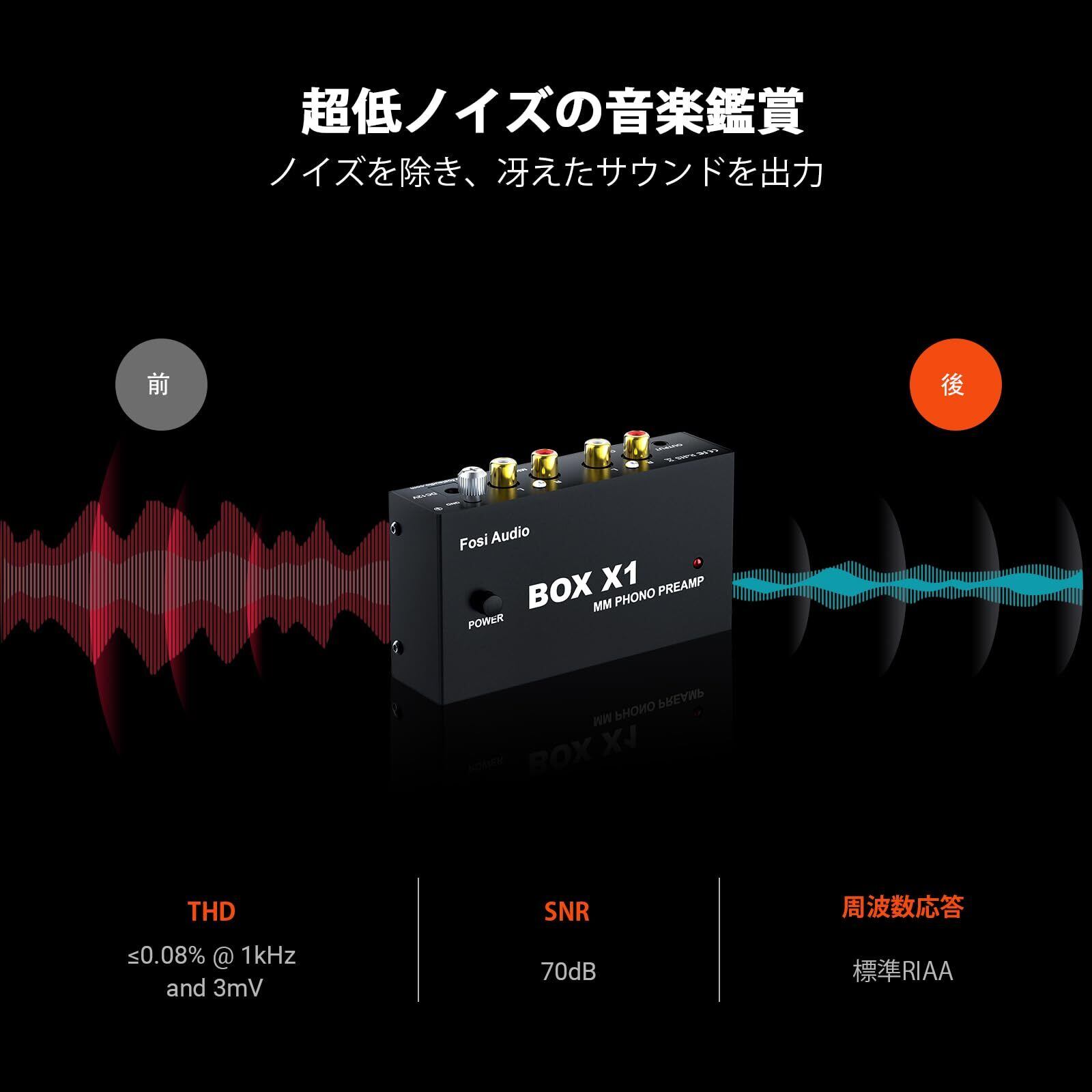 【超小型フォノプリアンプ】 Fosi Audio BOX X1フォノプリアンプは、ターンテーブルの音質をラインレベルに変換して、音声と音量を改善します。ポータブルで耐久性のある金属シェル付きの超小型フォノプリアンププリアンプ。超低騒音のオーディオ性能と優れた音質を提供し、歪みを低減します。ブラックテープレコーダー/プレーヤー/ステレオ/DJミックス対応で、DIYが欲しい家庭オーディオシステムに役立ちます。※ BOX X1はMMカートリッジ専用のフォノプリアンプです。MMカートリッジ入力端子のみを搭載しており、その他の音声入力端子は備えておりません。