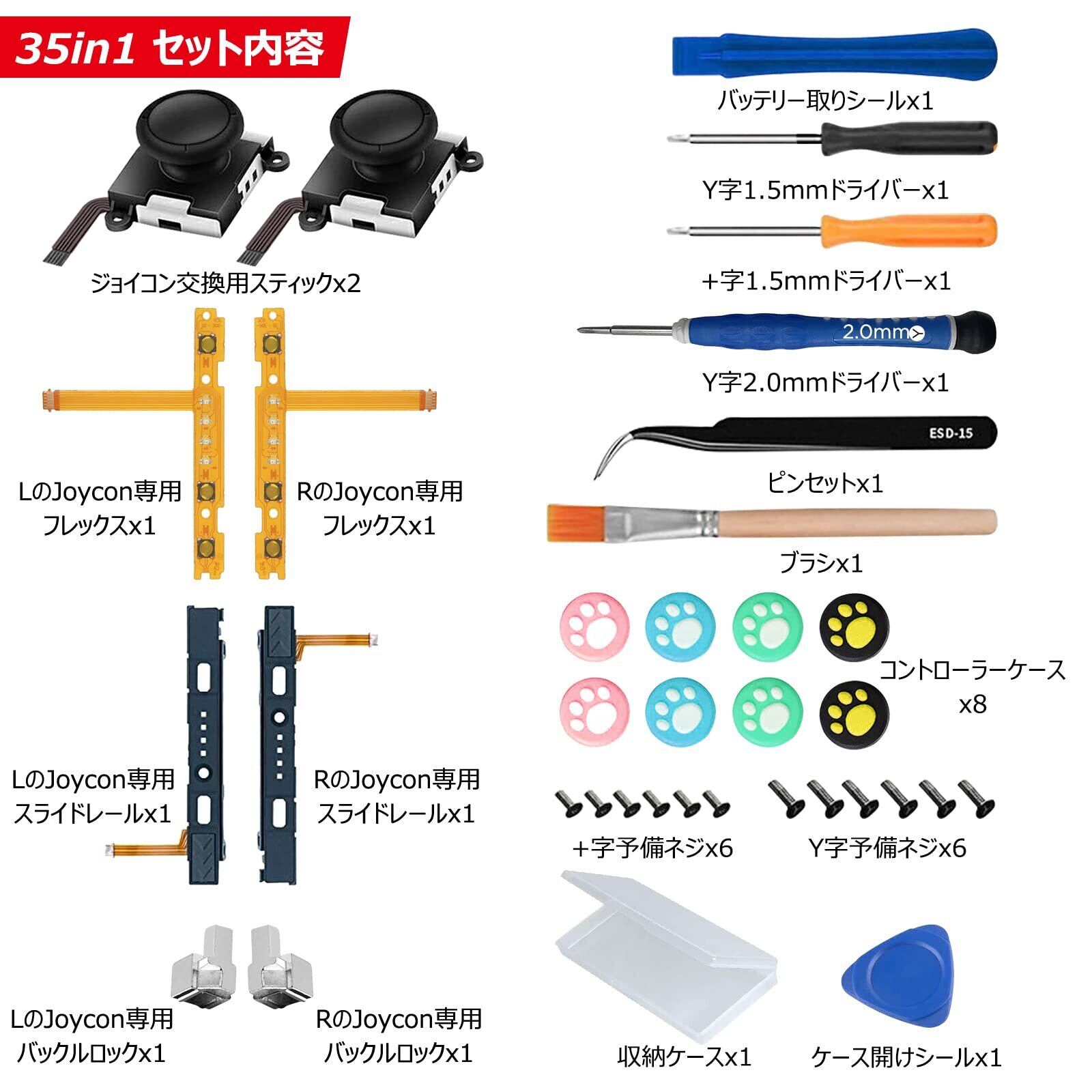 GeeRic 【35in1 ジョイコン修理セット】 Switch 修理キット Switch Joy-con 対応 コントローラー 修理セット スイッチ ジョイコン スティック 交換パーツ2個 SR SL キーボタン フレックスケーブル 左右セット2個 ライトケーブル2個 バックルロック2個