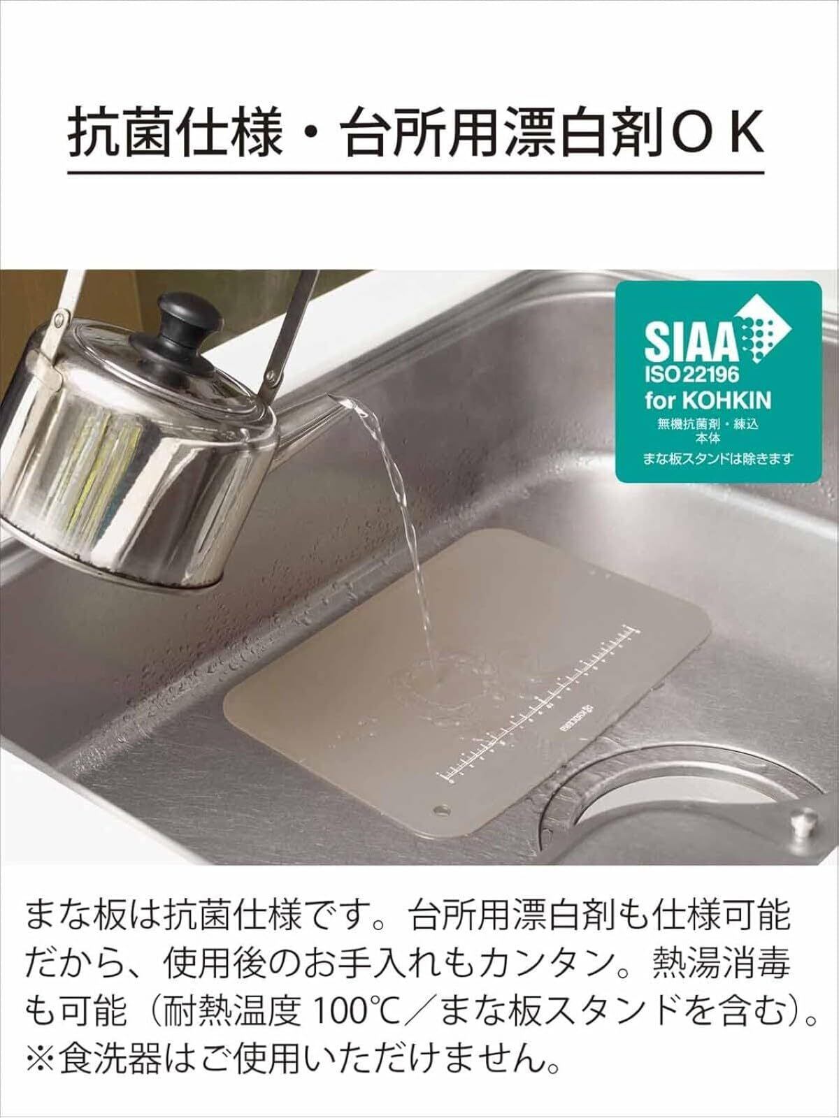 素材・材質:ポリプロピレン[熱可塑性エラストマー](耐熱温度100度)、付属品:まな板スタンド