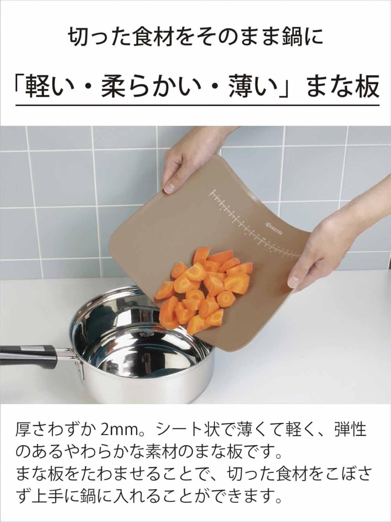 【切った食材をそのまま鍋へ】柔らかい素材だから切った食材をそのまま鍋に運んで入れられる
