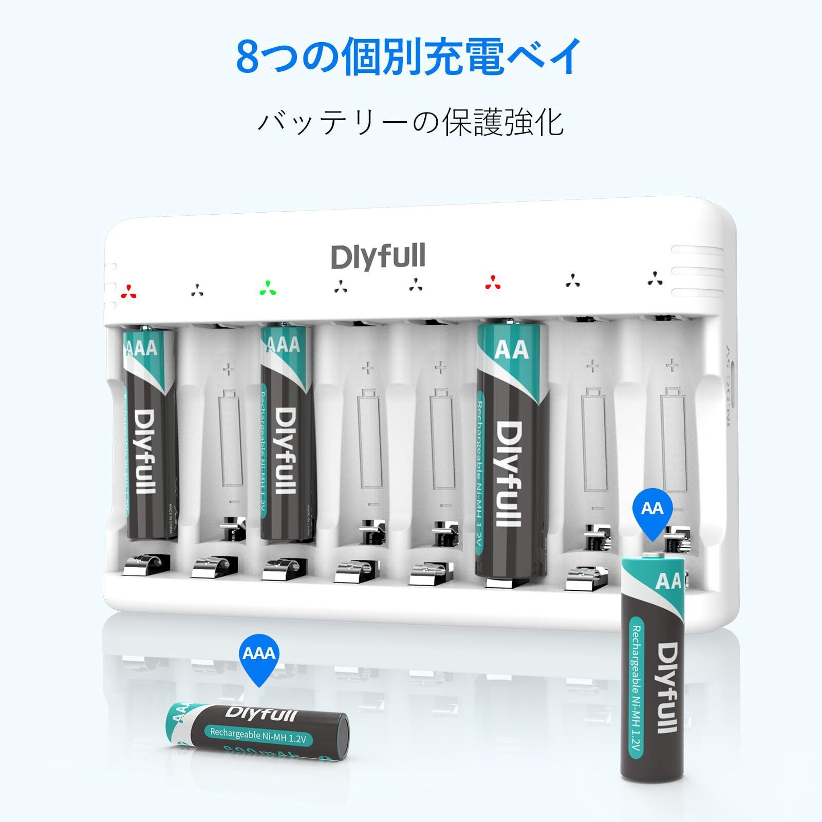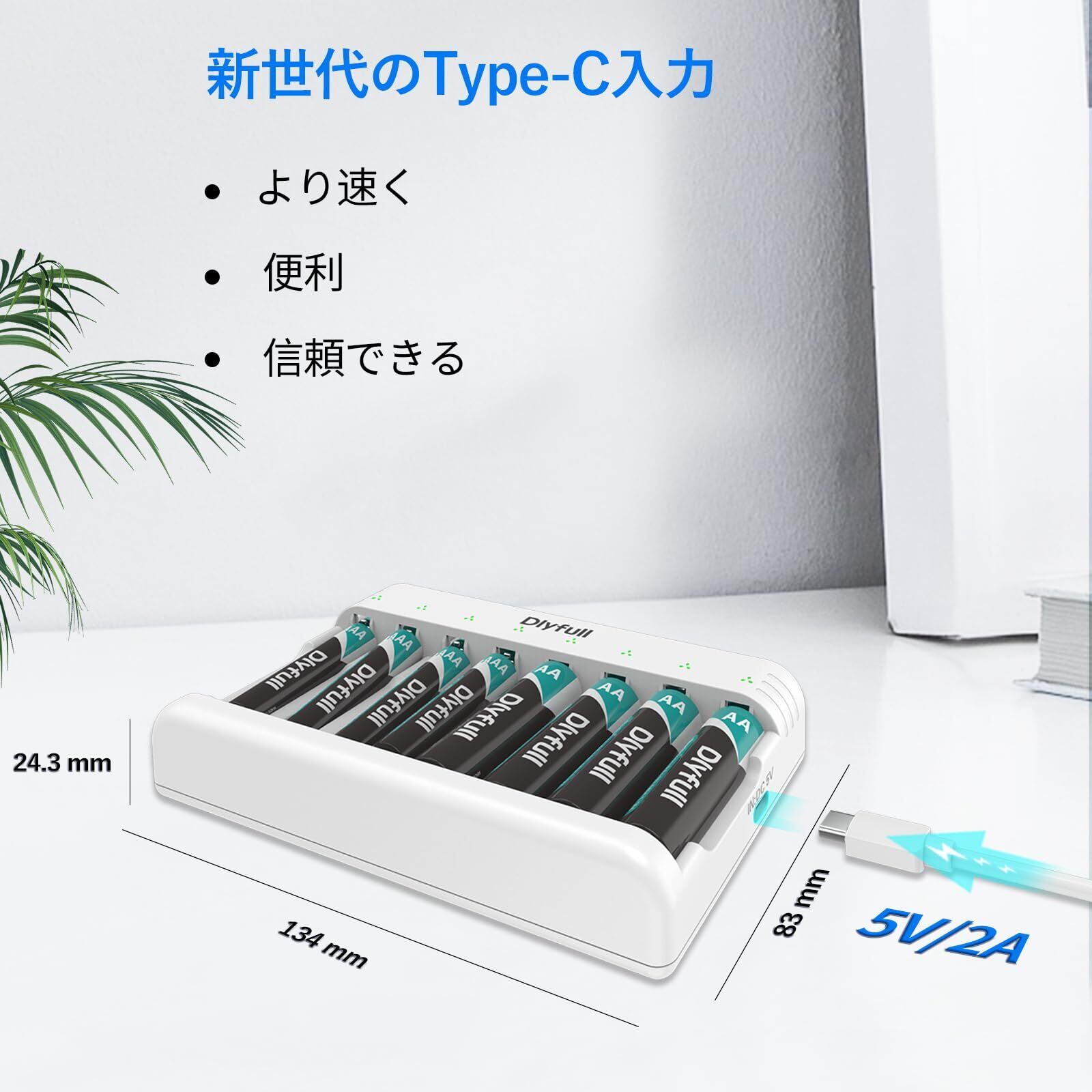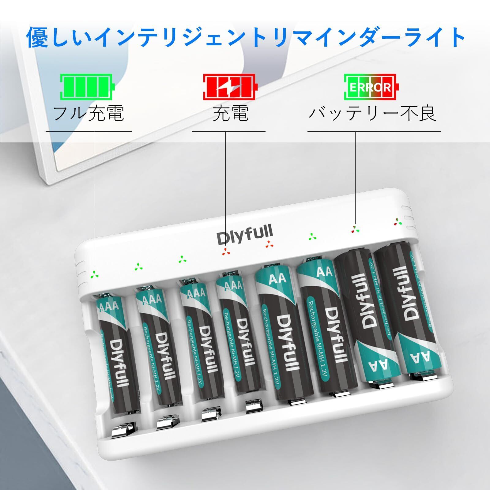 Dlyfull 電池充電器 単4 単3 充電池 充電器、USB Type-C入力 8スロット単三 単4 充電器/充電式ニッケル水素電池 充電器/ニカド充電池に対応 同時充電 LEDライト 単3 バッテリー 充電器 エネループ 充電器 単3 充電池充電器 (白色)