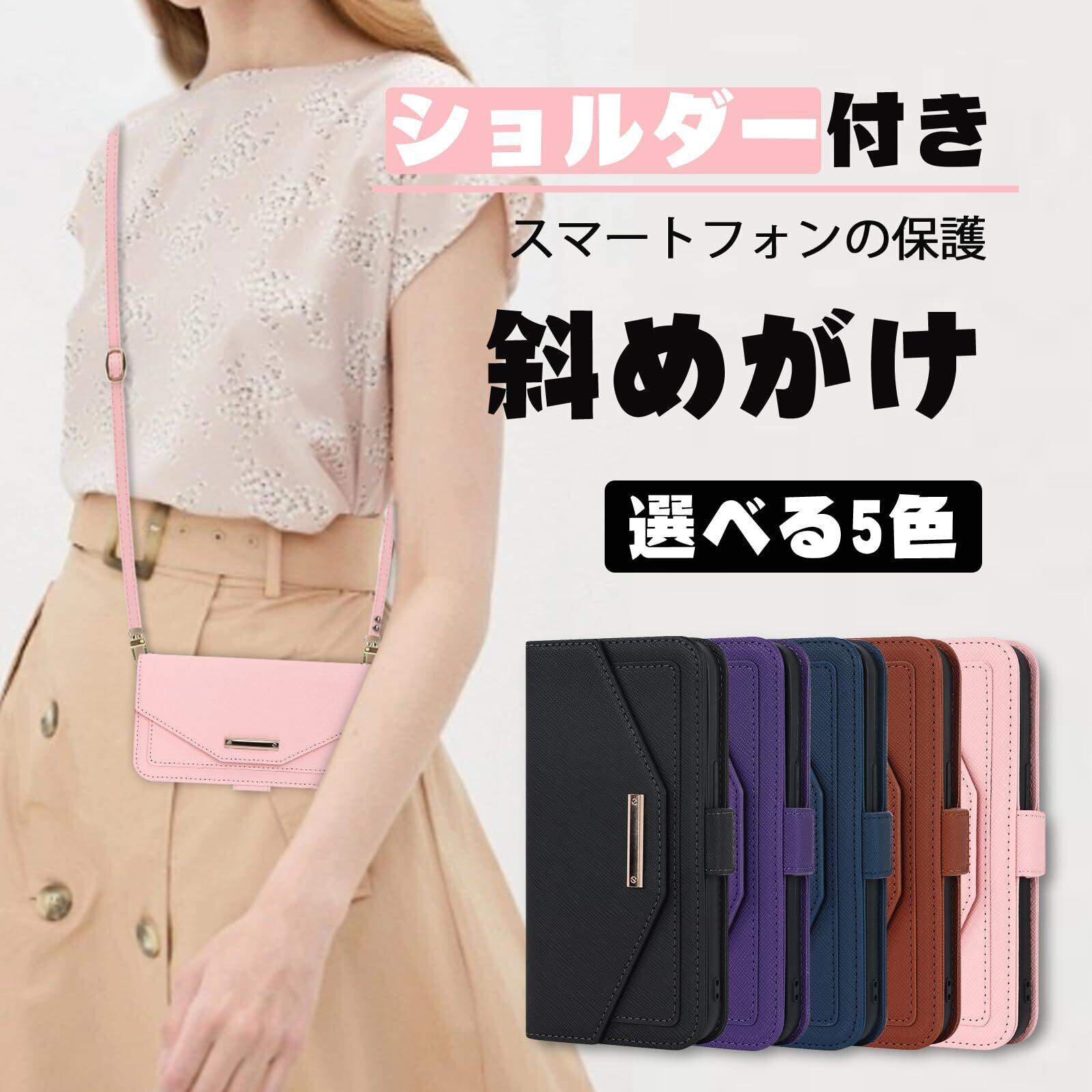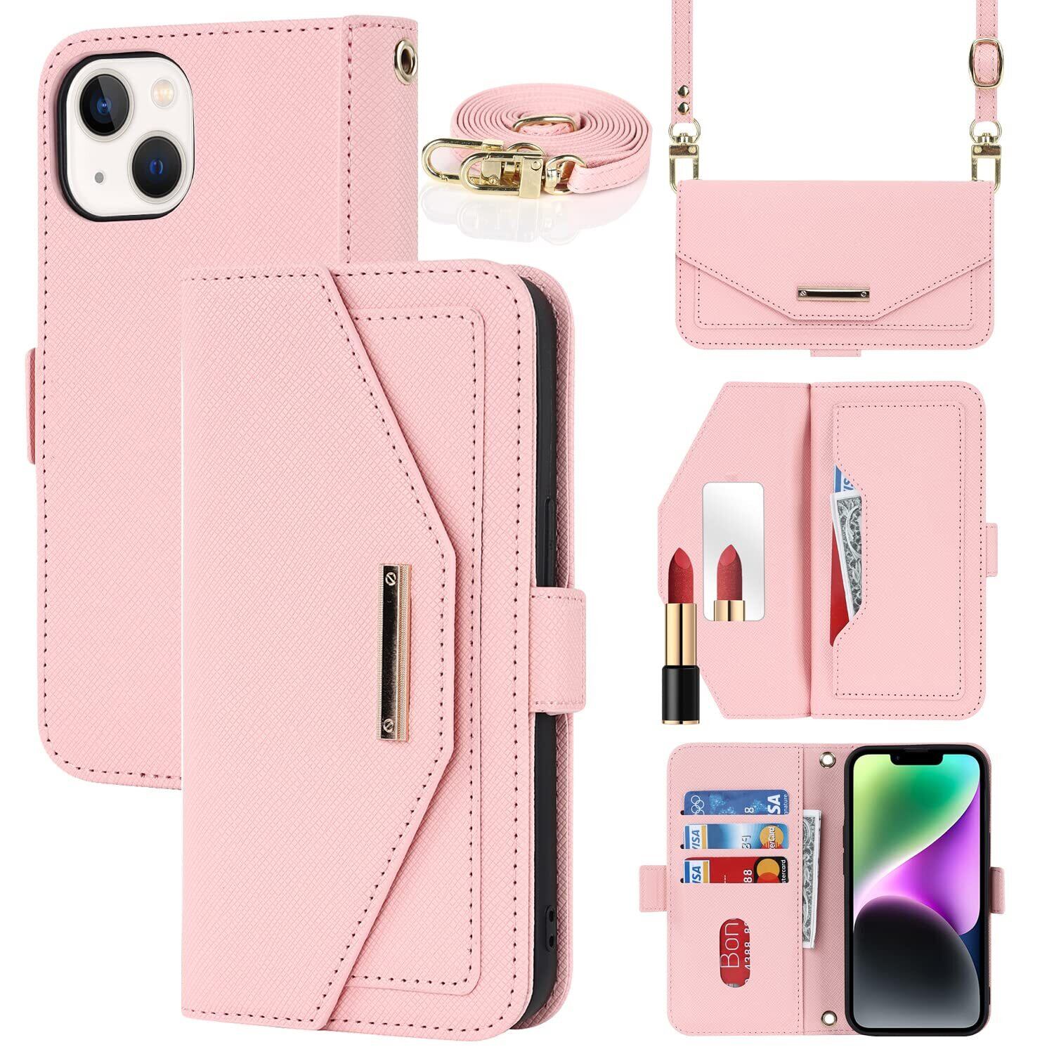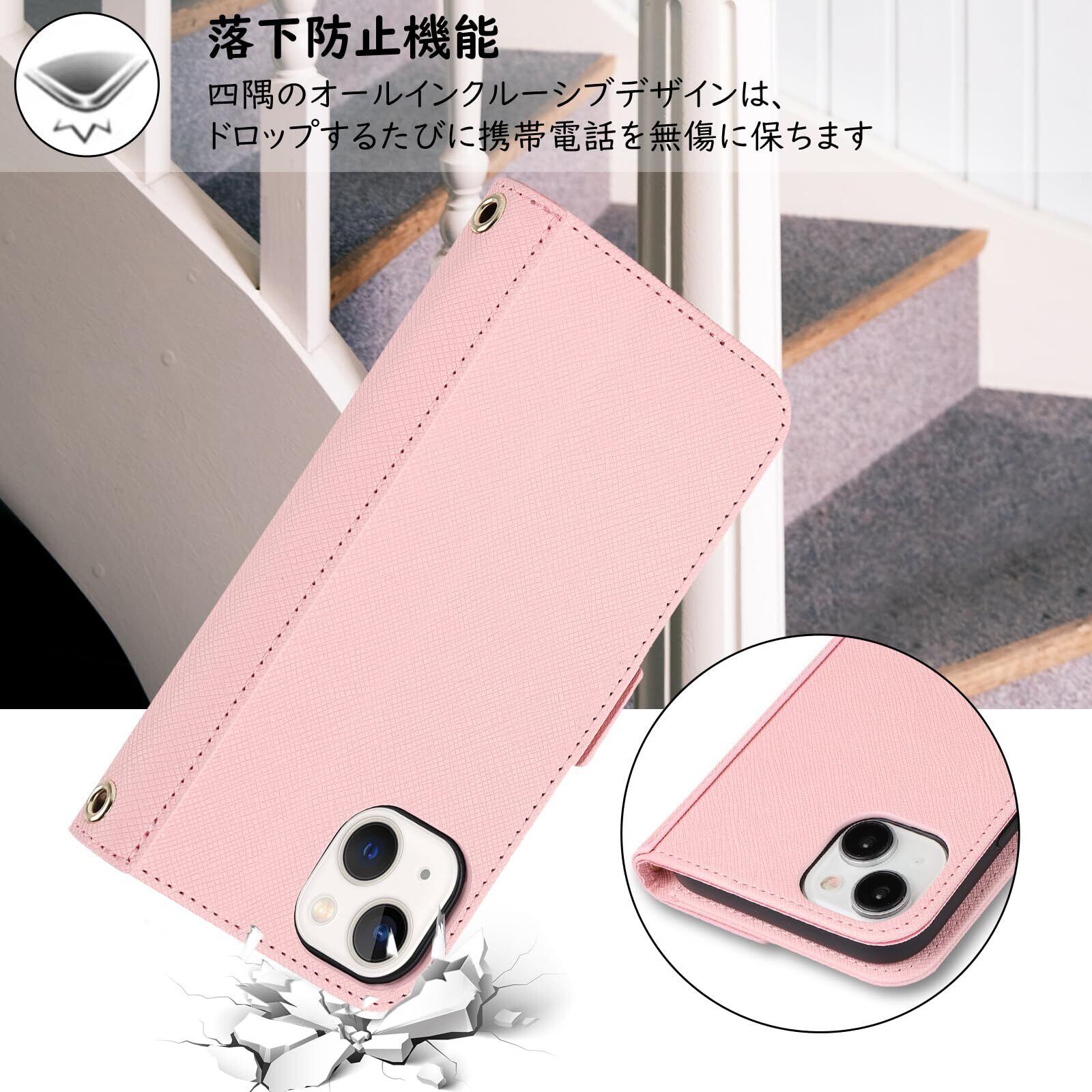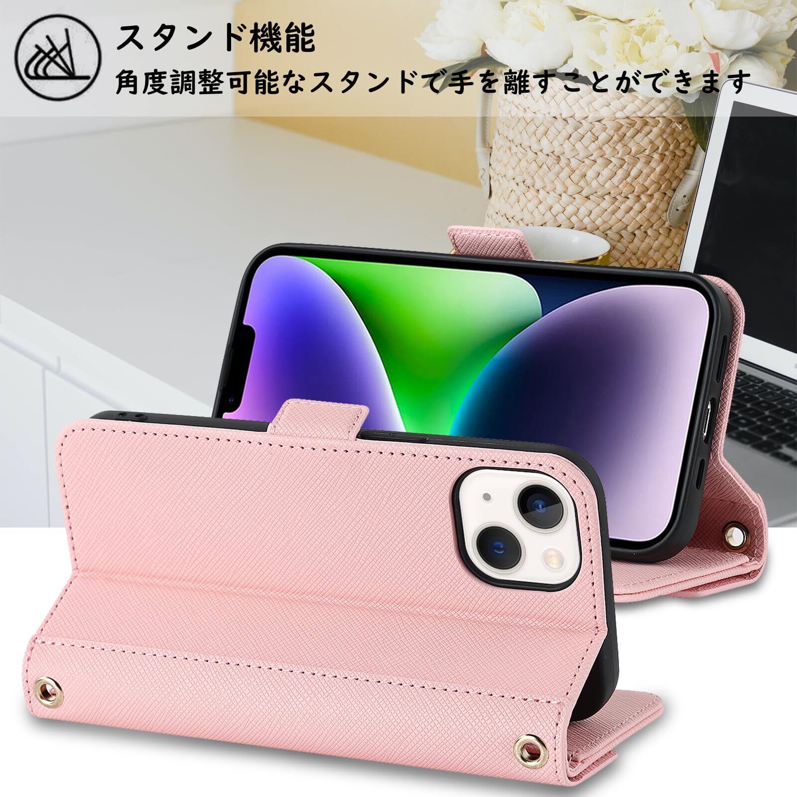 【Hamany】 対応 iphone 15 ケース ショルダー 鏡 スマホケース iphone 15 ストラップ付き ミラー カード収納 財布 いphone15 ケース 手帳型 クロスボディケース 肩がけ 首掛け 斜め掛け 耐衝撃 レザー あいふおん15ケース カバー -ピンク