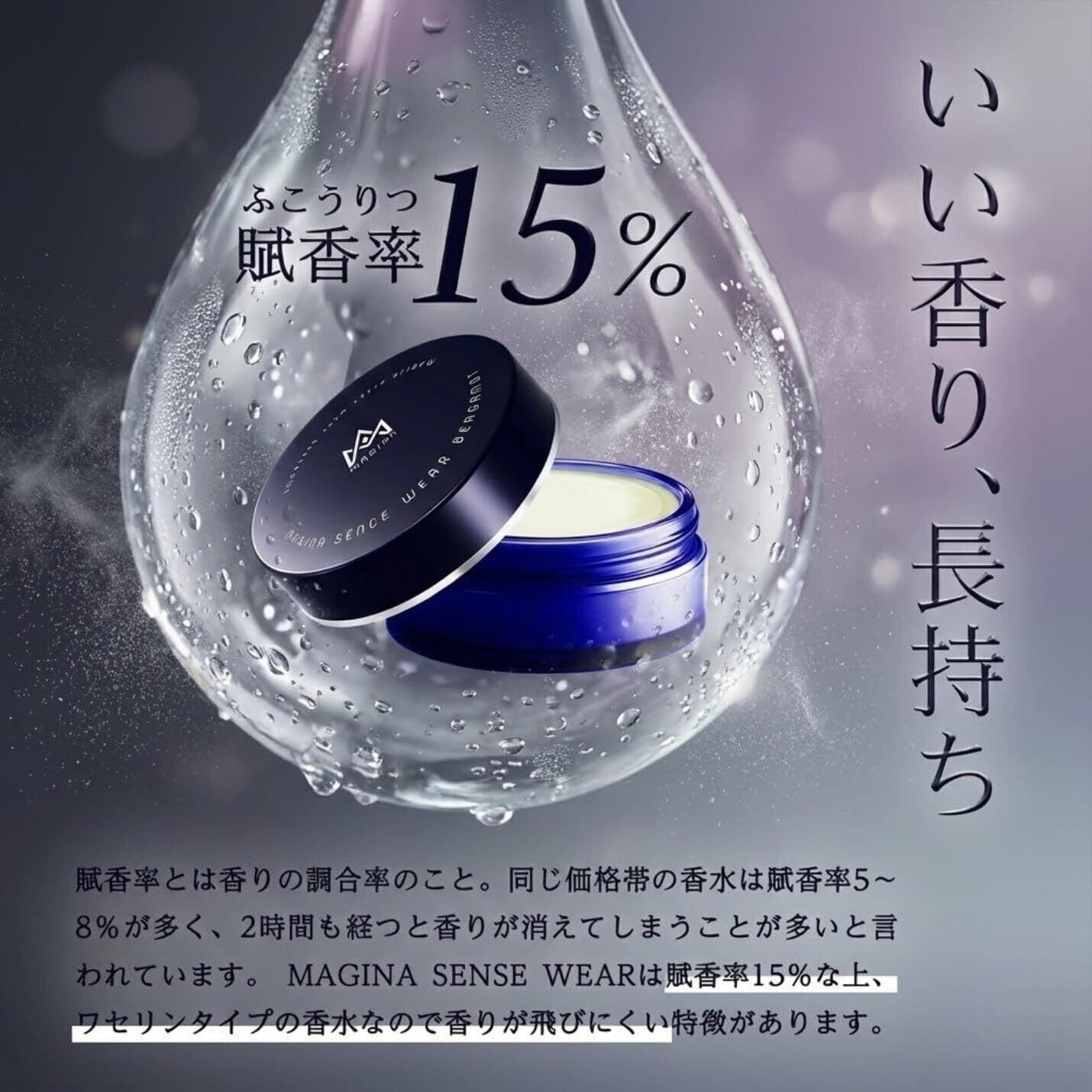 【高賦香率で 香りが長持ち! ワセリンベースの練り香水】 本製品はアルコールフリーのワセリンタイプ(パフュームバーム)で、肌への刺激が少なく保湿も兼ねた優しい使い心地が特長です。一般的な香水よりも揮発しにくい練り香水の特性と、高濃度香料を肌に密着させることで、香りの持続性がさらにアップ。「香水 メンズのキツい匂いが苦手」という方でも、ほのかに、ふんわりと香るため、加齢臭対策や体臭が気になる方にも最適です。