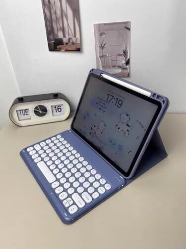iPad 11 インチ2025(A16)/第10世代 10.9インチ キーボード付き ケース 縦 回転 アイパッド ペン収納 耐衝撃 透明 クリア マグネット分離式 丸型キー ワイヤレスBluetoothキーボード 可愛い, 紫灰