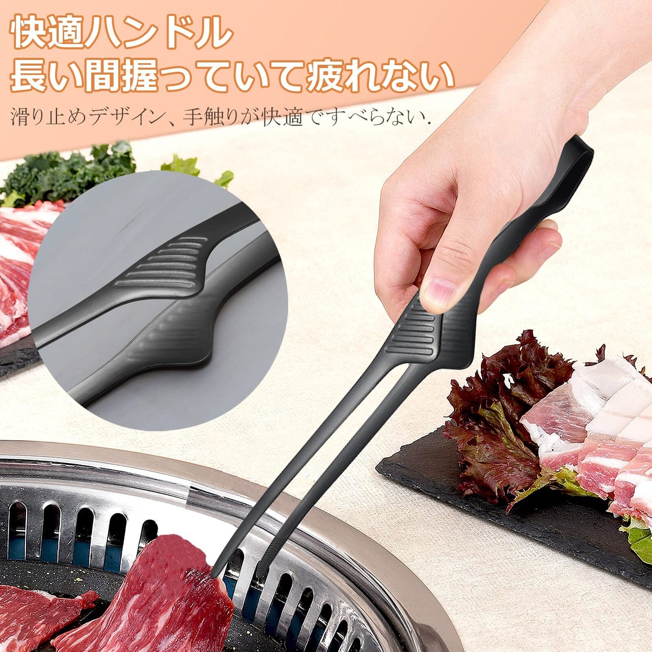 【食材を逃がさない焼肉トング】トングの先端の滑り止め溝が薄切り肉も確実キャッチ!くぼみ形状でとんかつや野菜の返し作業がスムーズします。バーベキューやキャンプ料理の下ごしらえから鉄板焼きまで自由に使える指先トングです。