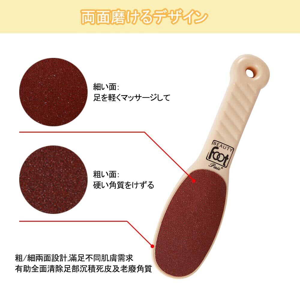 【特徴】人間工学に基づいた持ち手設計で簡単角質除去。両面磨けるデザイン、粗い面:硬い角質をけずる、細い面:足を軽くマッサージして、足が柔らかく滑らかになります。ハンドルには穴があるため、吊り下げることができ、使用後の乾燥に便利です。