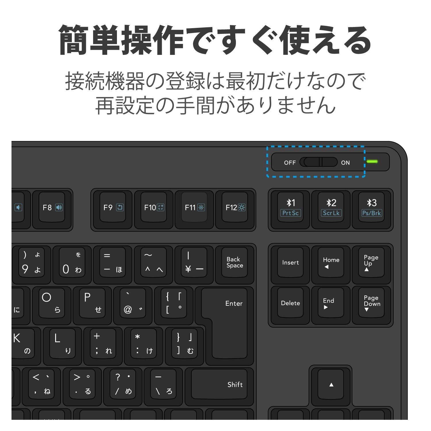 大型のエンターキーや、独立して配置されたDeleteやInsertなどの特殊キーにより、誤入力しにくく快適なキータイピングが行えます。