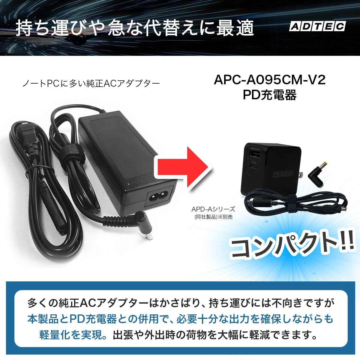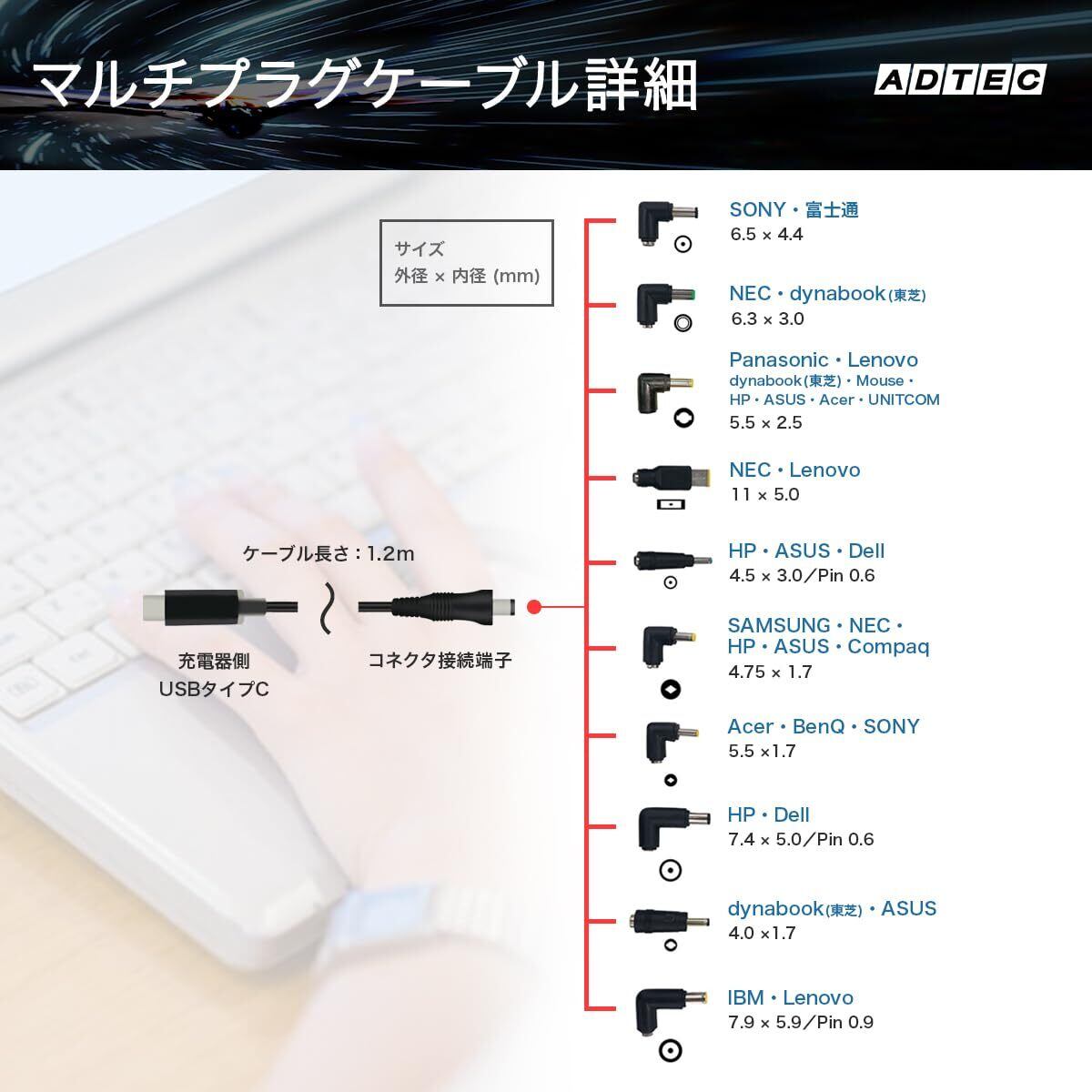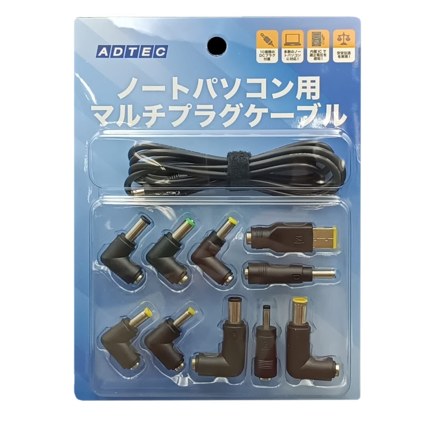 アドテック ノートパソコン用 マルチプラグケーブル eMarker搭載 1.2m PD充電 95W対応(USB Type-C/10種類コネクタ付属)ノートPC 充電器 ACアダプタ DC 変換ケーブル トリガーケーブル APC-A095CM-V2