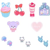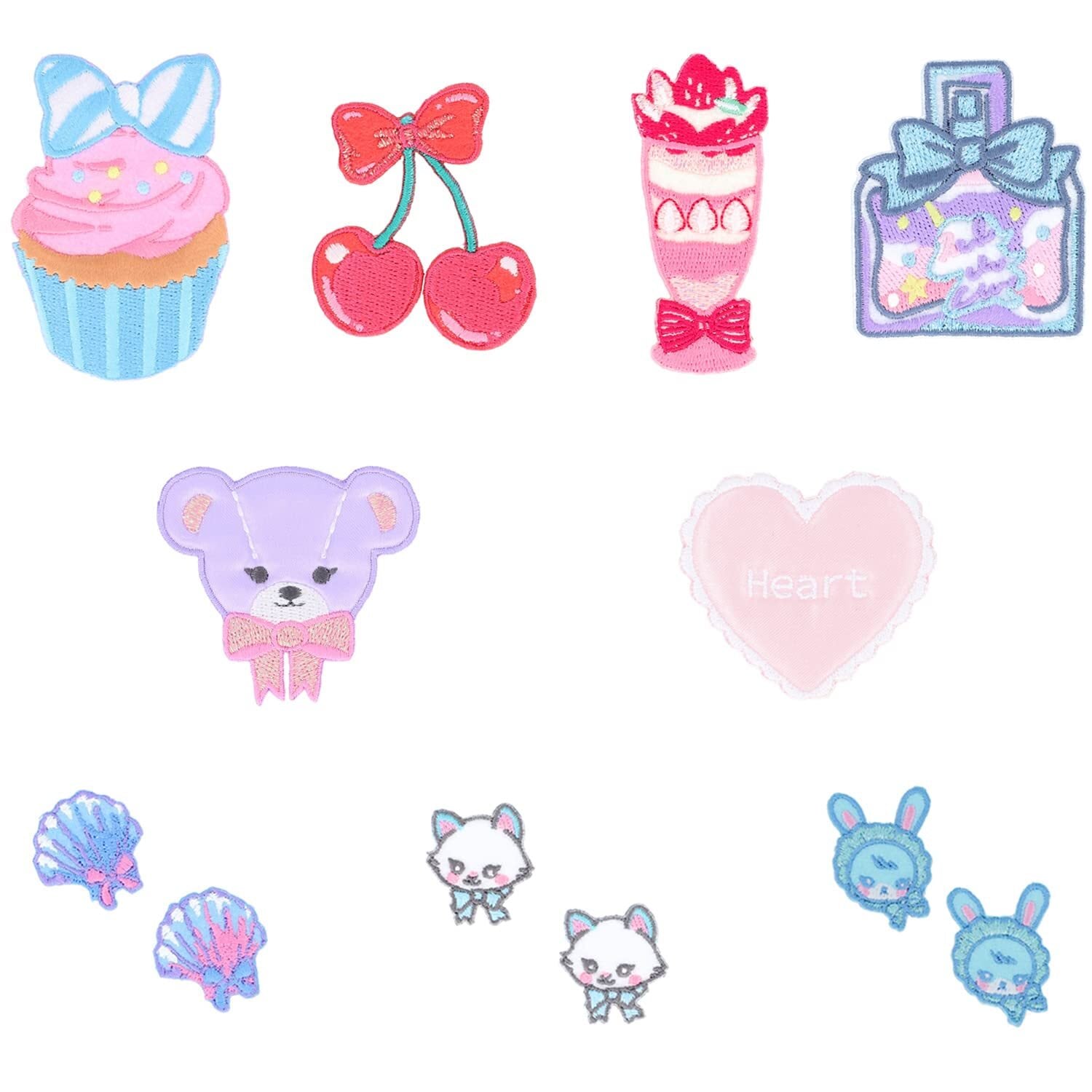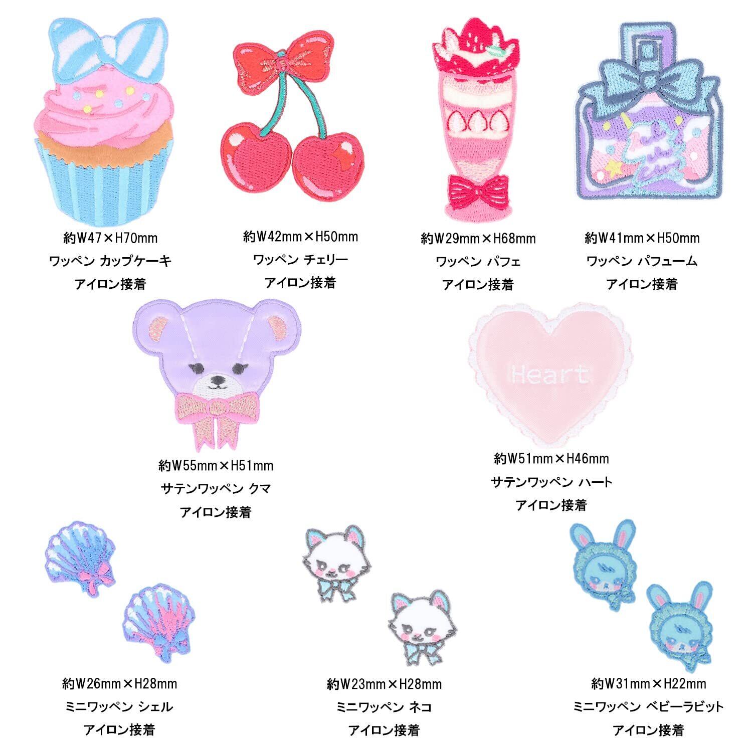 セット内容:CMOC-35 チェリー 、 CMOC-20 パフェ 、 CMOC-21 カップケーキ 、 CMOC-54 パフューム 、 CMOC-59 サテンワッペン クマ 、 CMOC-56 サテンワッペン ハート (サテンワッペンは光沢のある少しぷっくりしたサテン地にラメ糸でキラキラ可愛い刺繍ワッペン)、CMOC-49 ミニワッペン ネコ 、 CMOC-08 ミニワッペン シェル 、 CMOC-48 ミニワッペン ベビーラビット