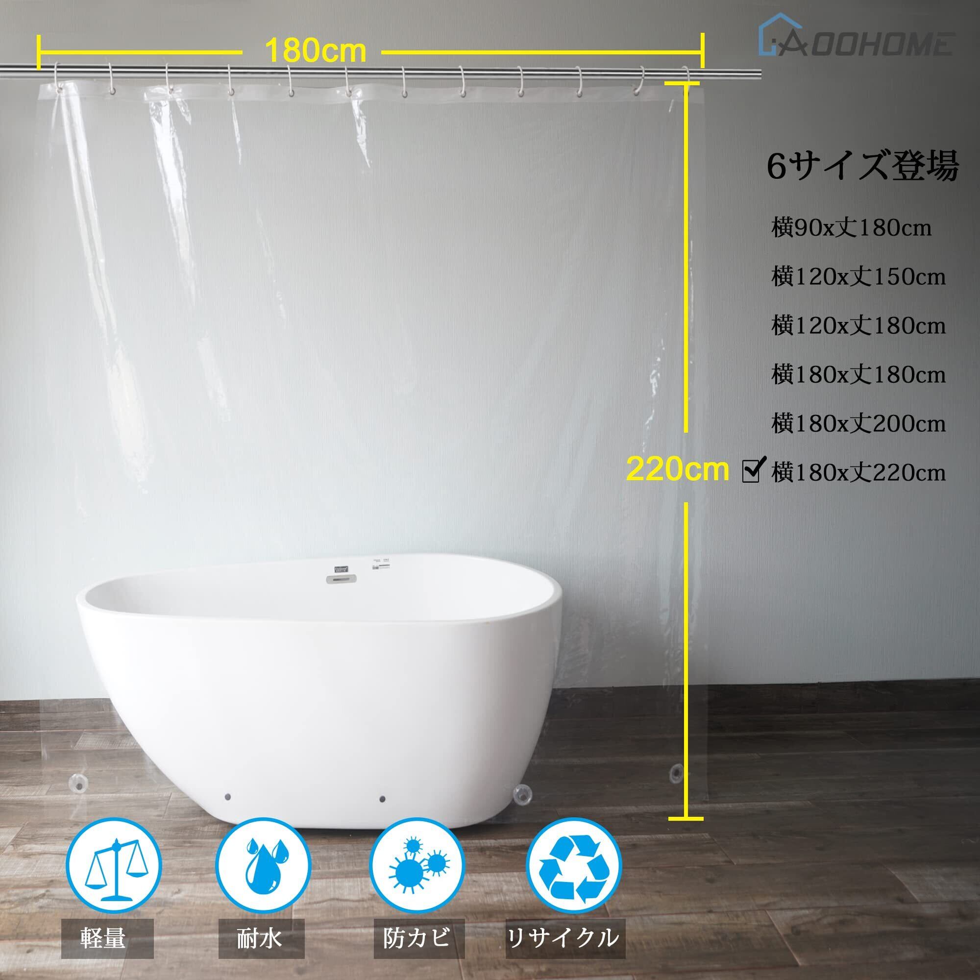 AooHome シャワーカーテン 透明 ビニール バスルーム ユニットバス 浴室 間仕切り クリア 軽量 フック付き 180x220cm ロング丈 丈220cm