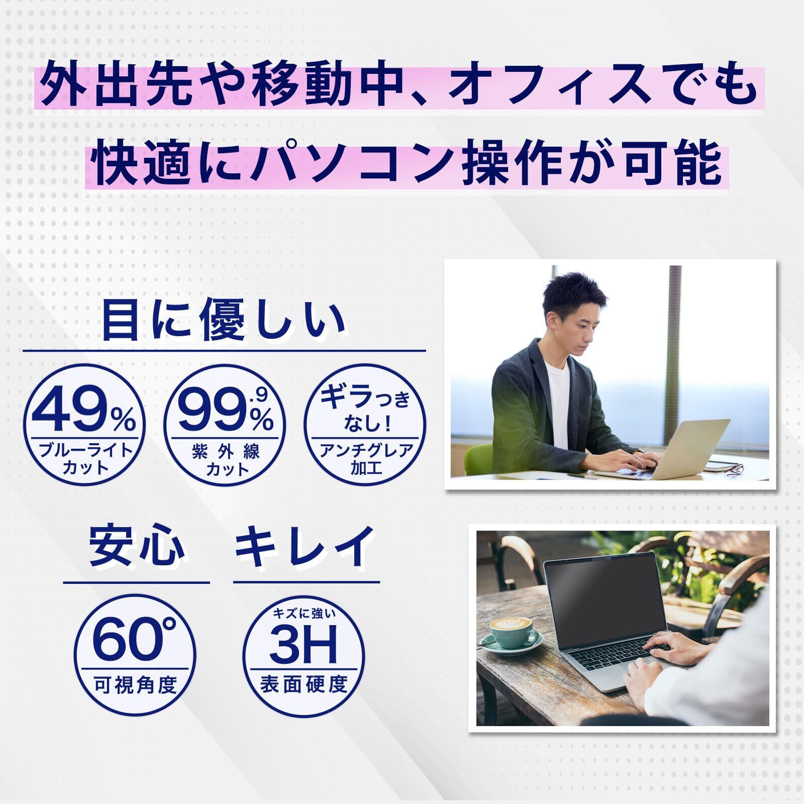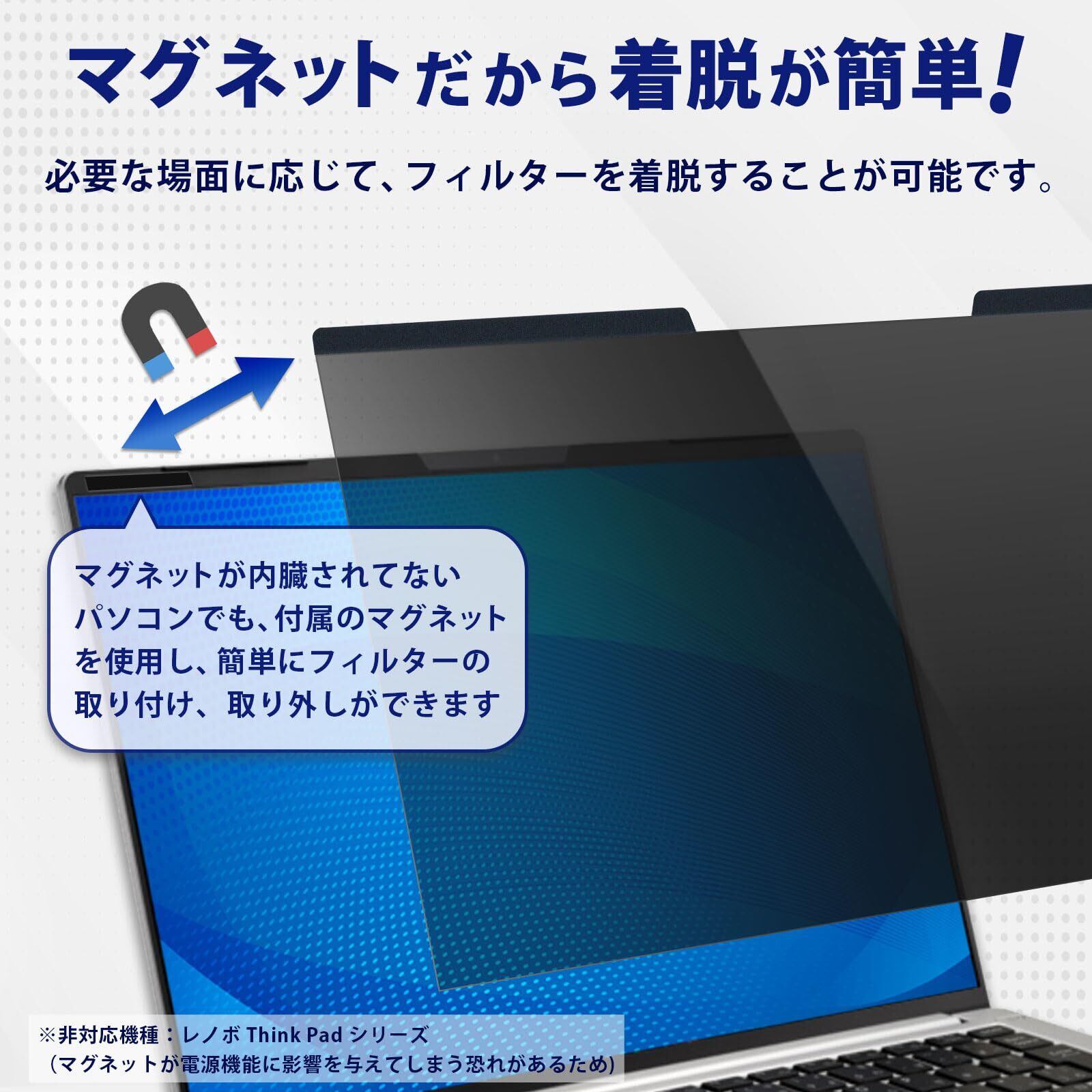 安心作業:移動中やオフィスでの周りからの視線を防いで、安心してパソコン操作ができるのぞき見防止フィルターです。■※非対応機種:レノボ Think Pad シリーズの一部機種 (Think Pad X390, Yoga,X1 Carbonなど)では、フィルター装着時、スリープセンサーの誤作動によって画面が映らなくなる場合があるのでご注意ください。その場合は、マグネットの位置をセンサーからずらして調整することによって改善される可能性があります。