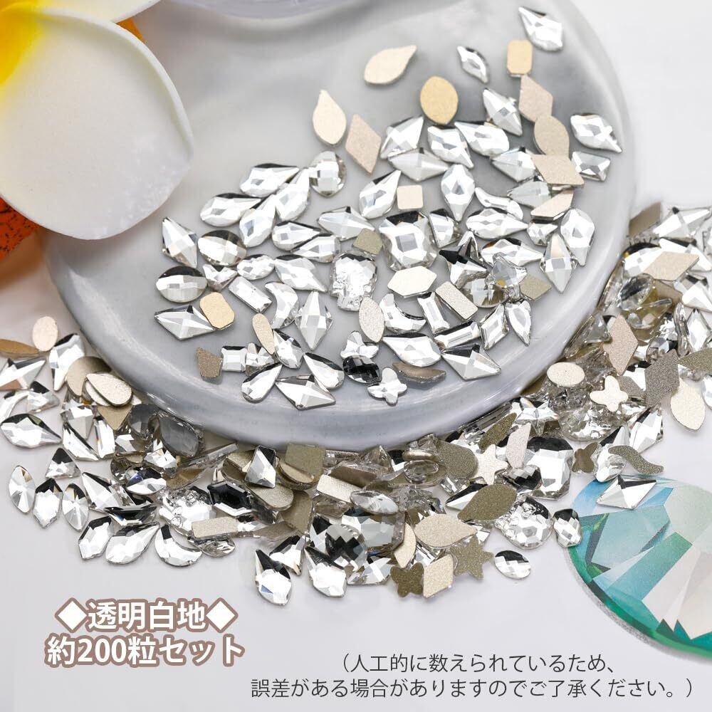 サムコス ラインストーン ネイルパーツ 約200粒セット 小さめ 多種多様なデザイン オーロラ幻彩 キラキラ 立体 平底 異形 ネイルストーン DIY カラー ネイルアート デコ用 (透明白地)