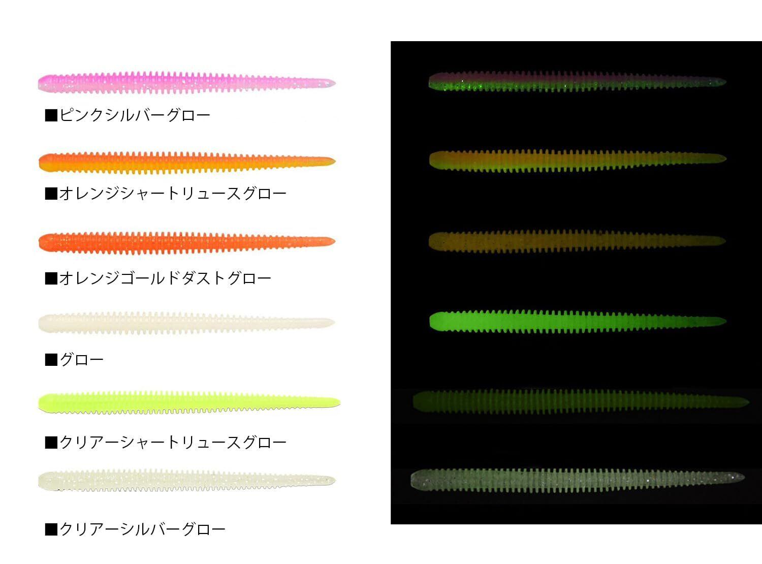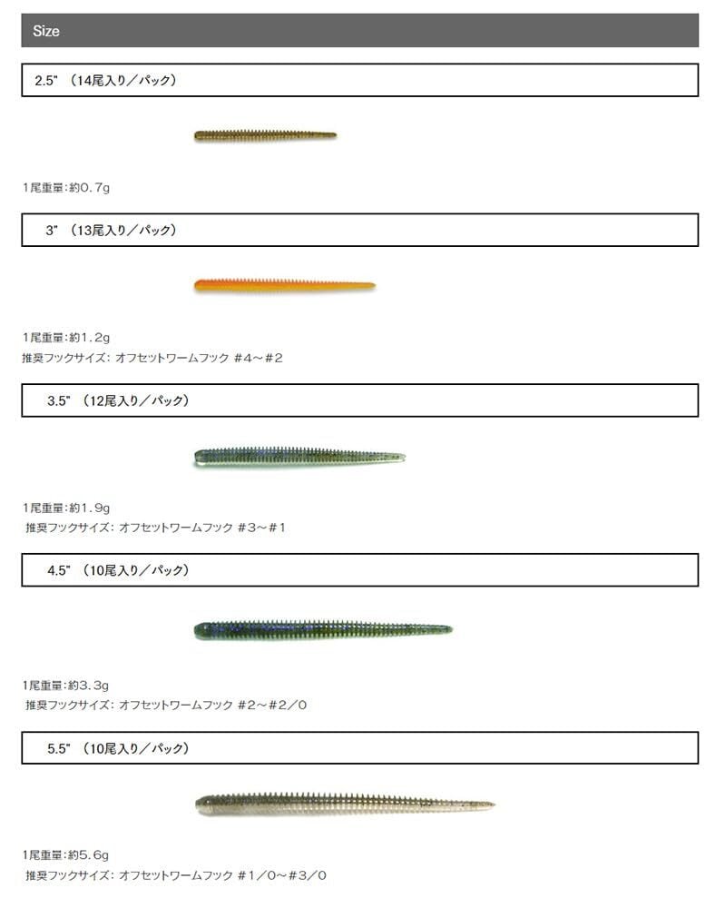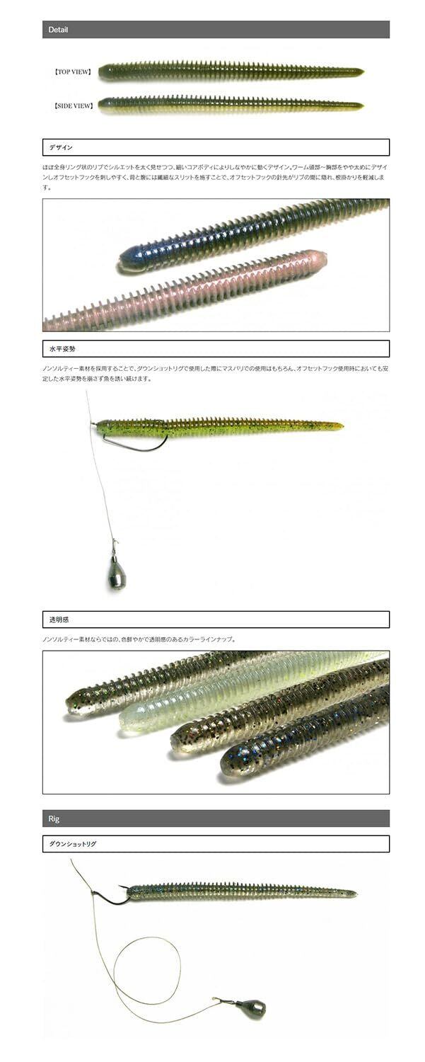 特徴:「日本製」「ノンソルティー素材 (塩配分なし)」「ほぼ全身リング状のリブボディ&細いコアボディ(しなやかに動くデザイン」「バス・アジング・ロックフィッシュ対応 (マスバリ・オフセットフック対応)」