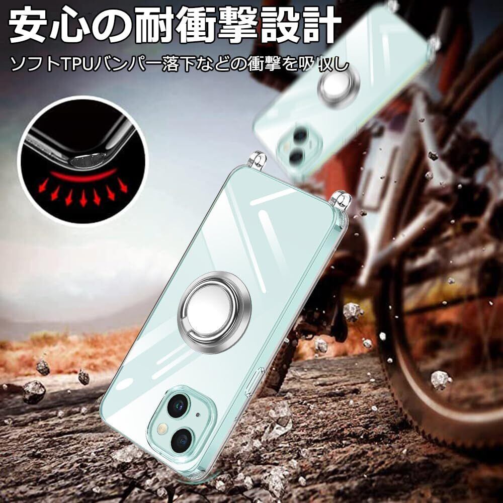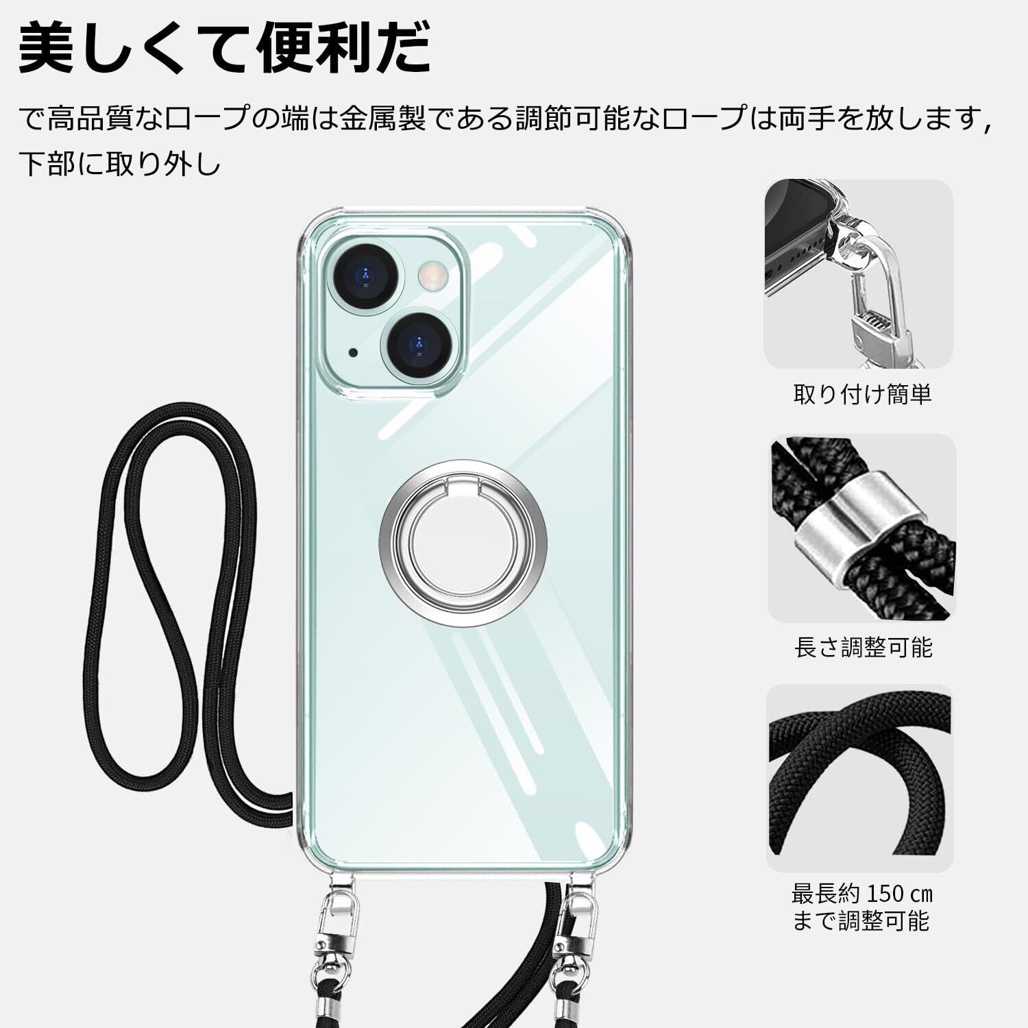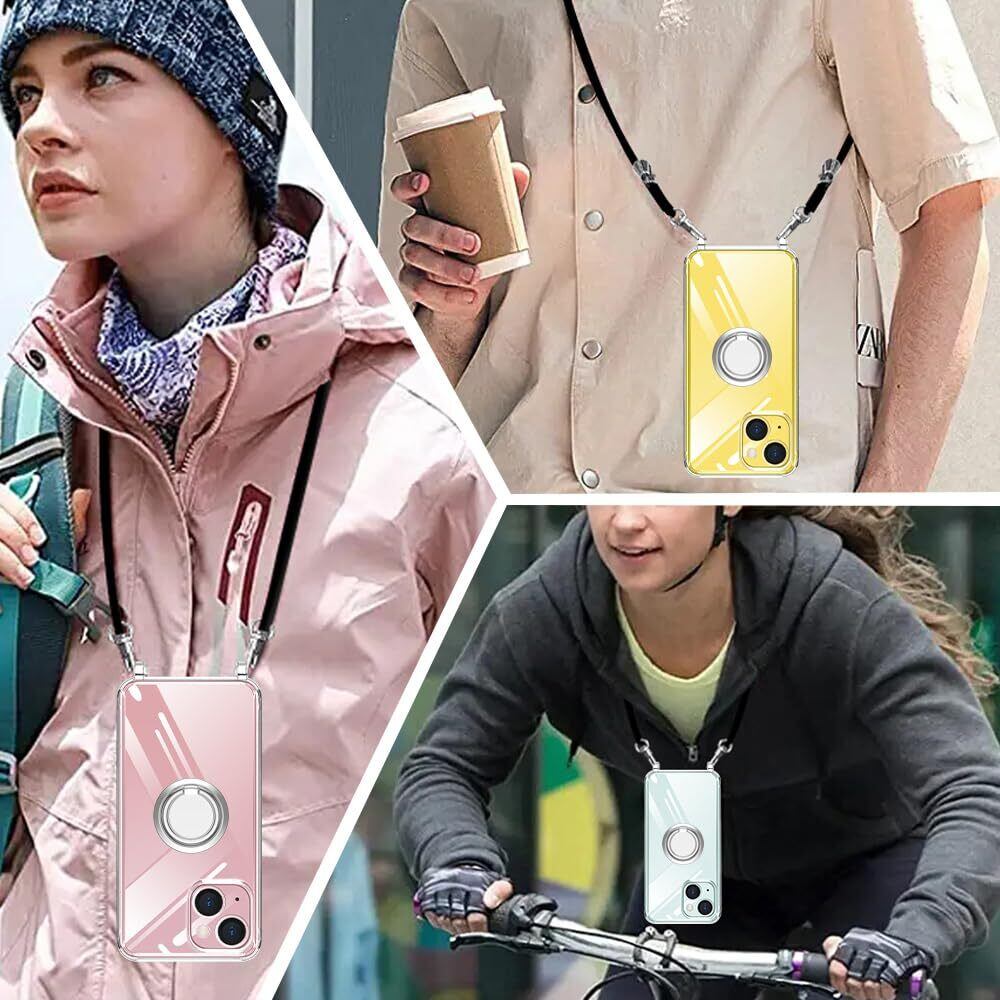 NISIILNG iPhone 15 用 ケース クリア ショルダー リング付き iPhone15 用 スマホケース 多機能スタンド アイフォン15 カバー 肩掛け 斜めかけ 縄掛けケース 透明 PC+ TPU ストラップ付き 携帯ケース 薄型 軽量 耐衝撃 360度回転 車載ホルダー対応 長さ調整可能 取り外し可能 落下防止 紛失防止 (iphone15ケース クリア)