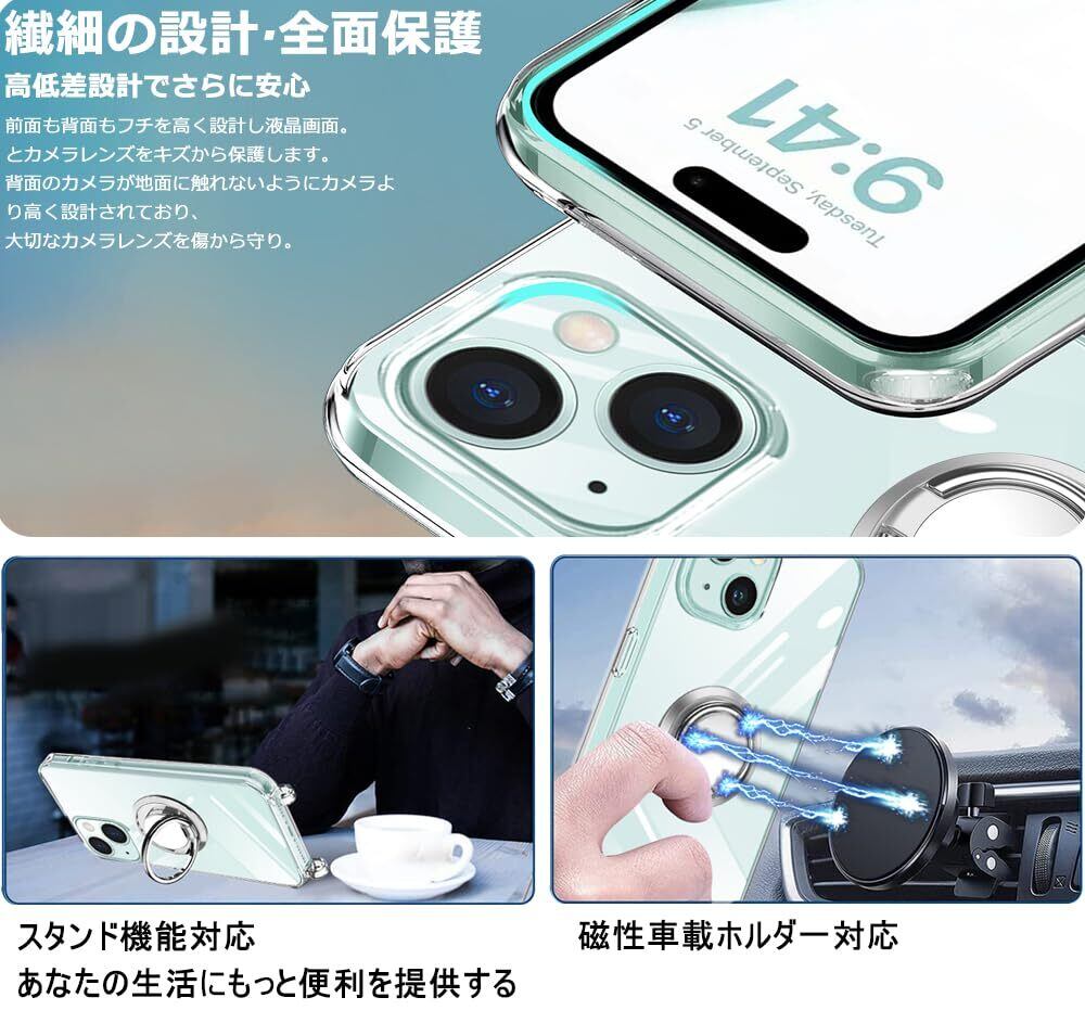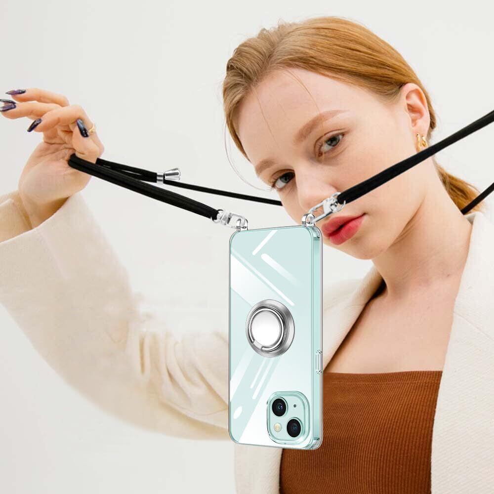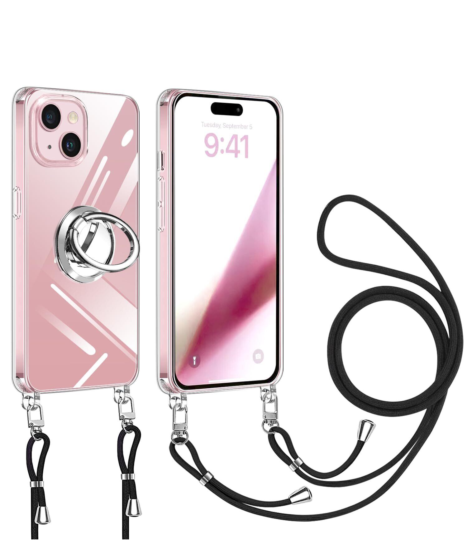 NISIILNG iPhone 15 用 ケース クリア ショルダー リング付き iPhone15 用 スマホケース 多機能スタンド アイフォン15 カバー 肩掛け 斜めかけ 縄掛けケース 透明 PC+ TPU ストラップ付き 携帯ケース 薄型 軽量 耐衝撃 360度回転 車載ホルダー対応 長さ調整可能 取り外し可能 落下防止 紛失防止 (iphone15ケース クリア)