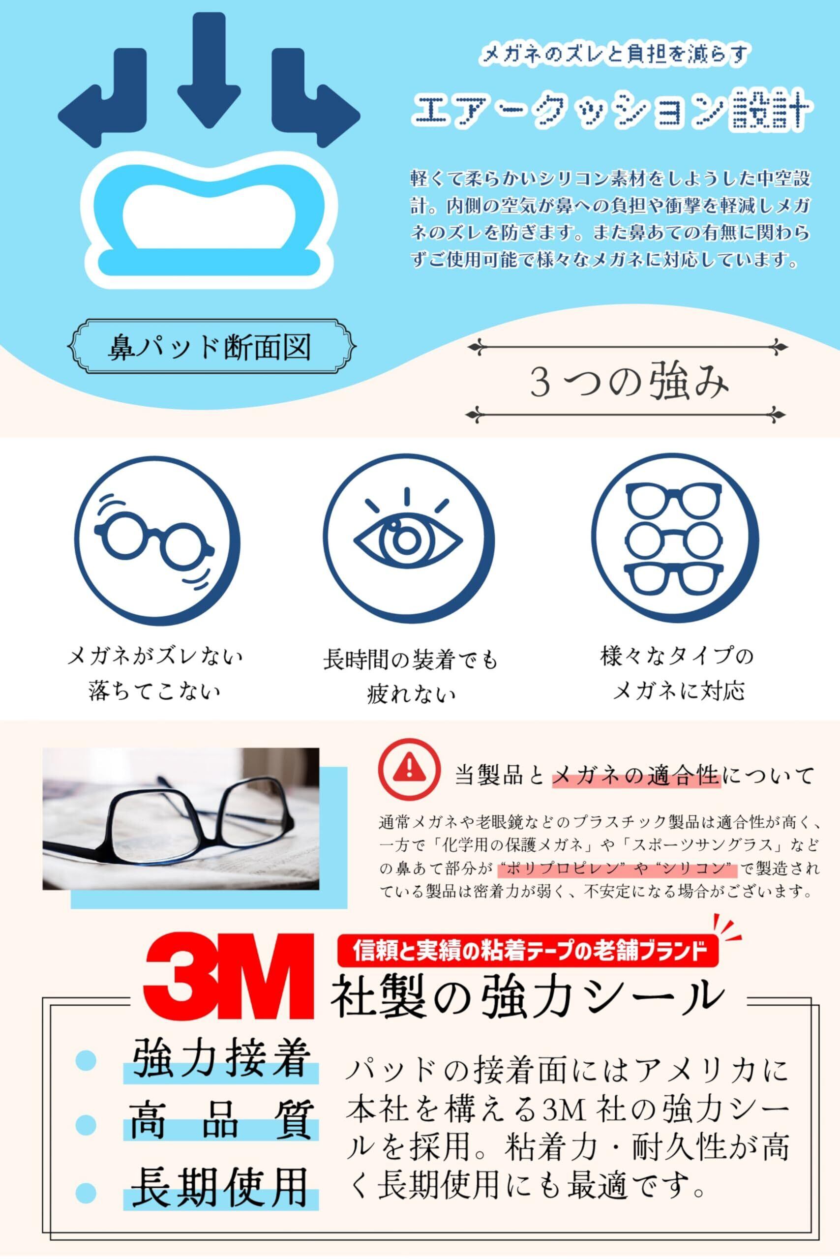 【ずれ防止】滑り止め加工が皮脂でメガネを滑るのを防ぎます。メガネの鼻あてにぴったりフィットし、鼻に優しく最高のつけ心地を体感できます。
