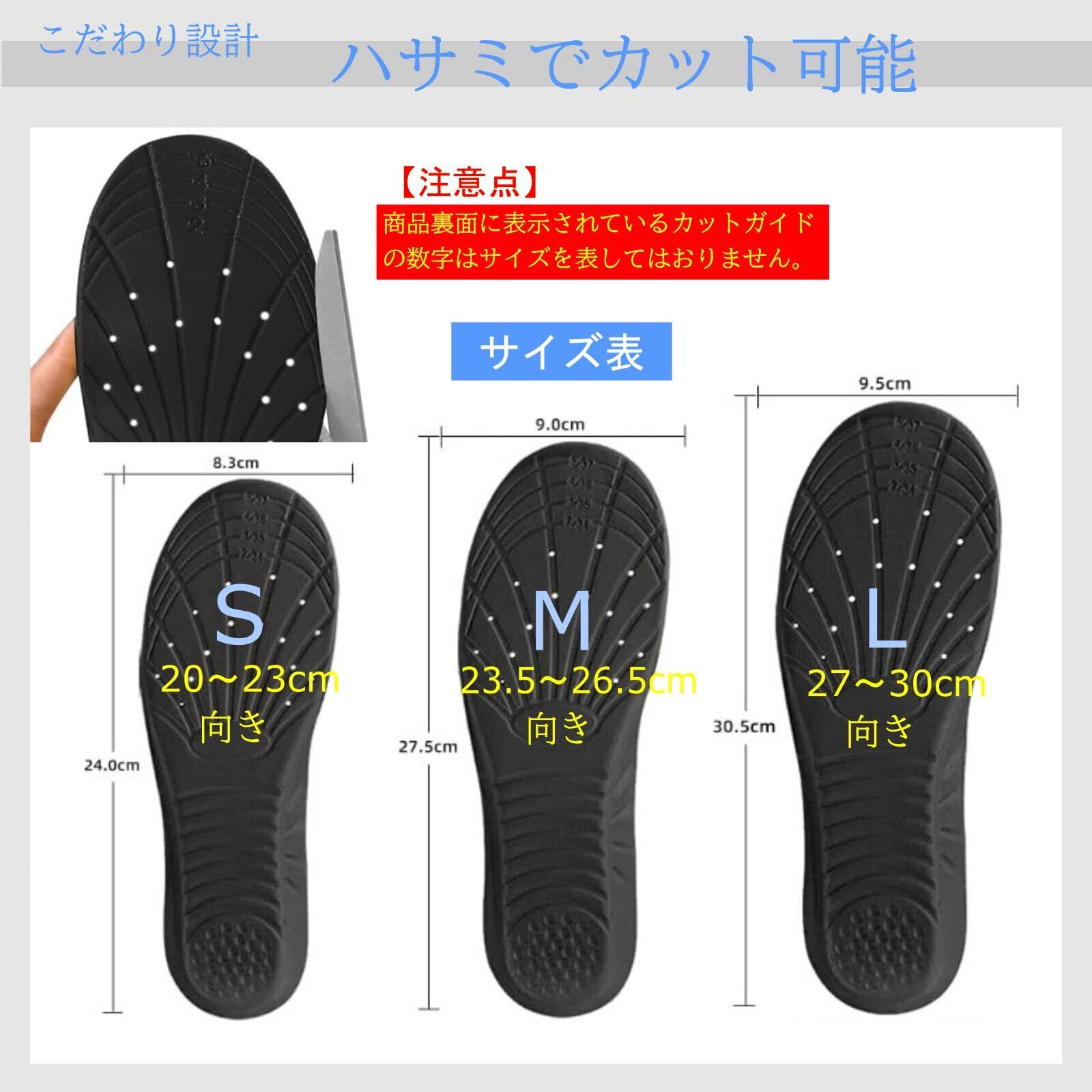【注意点】商品裏面に表示されている数字はサイズを表してはおりません。裏面の数字を確認してもSサイズ・Mサイズ・Lサイズの判別は出来ません。またサイズ調整時の参考にはなりません。かならず靴の上か現在靴に入っているインソールに合わせてカットしてください。