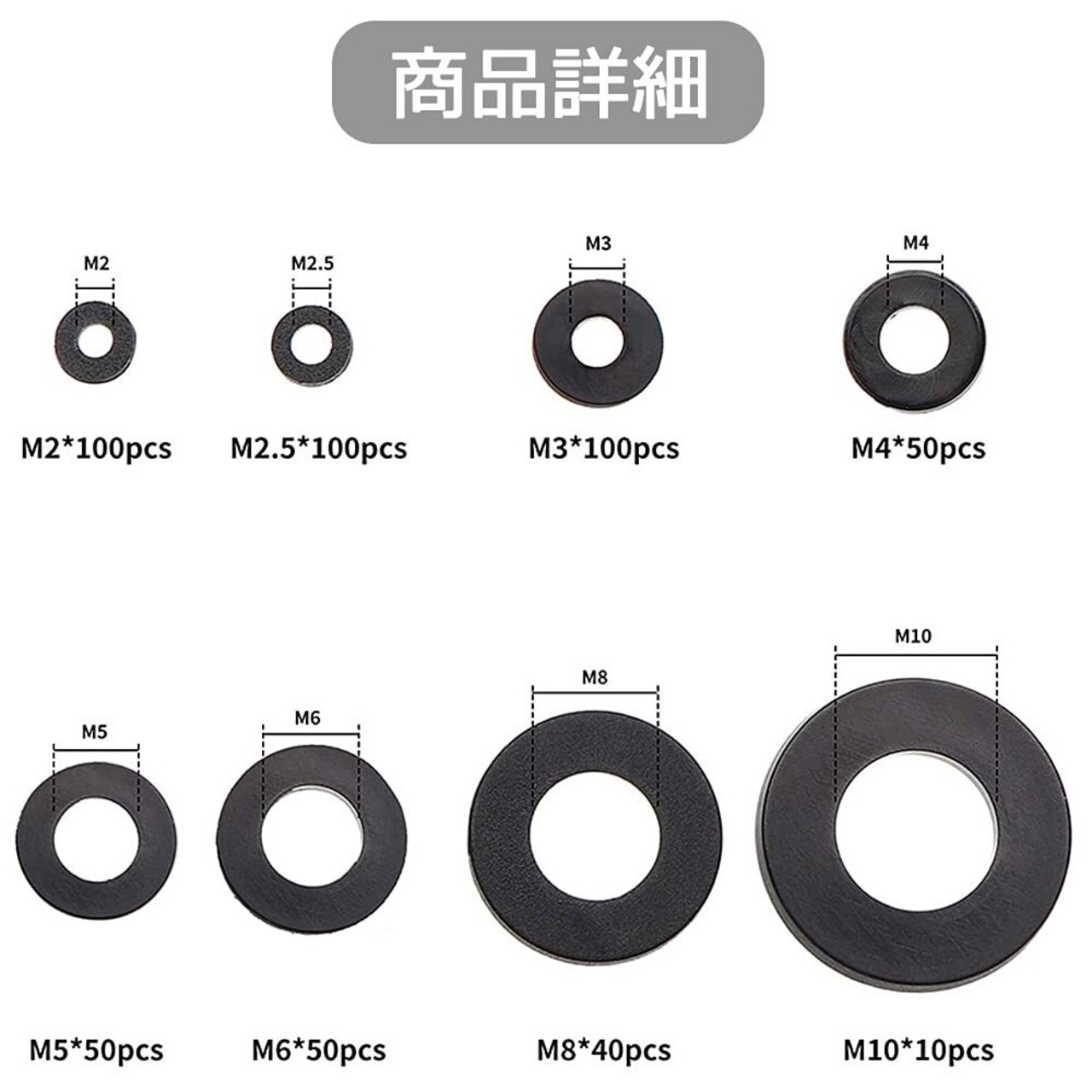 【商品仕様】M2*5*1(100個)、M2.5*5*1(100個)、M3*6*1(100個)、M4*8*1(50個)、M5*10*1(50個)、M6*12*1.2(50個)、M8*16*1.4(40個)、M10*20*2(10個)。
