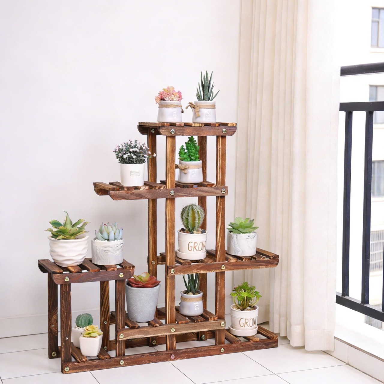 UNHO フラワースタンド 木製 ガーデンラック 4段 プランタースタンド 棚 鉢スタンド 多肉植物 観葉植物 ラック コンパクト 花台 ベランダ 玄関 園芸ラック 室内 幅60×高さ61㎝ かわいい 飾り棚