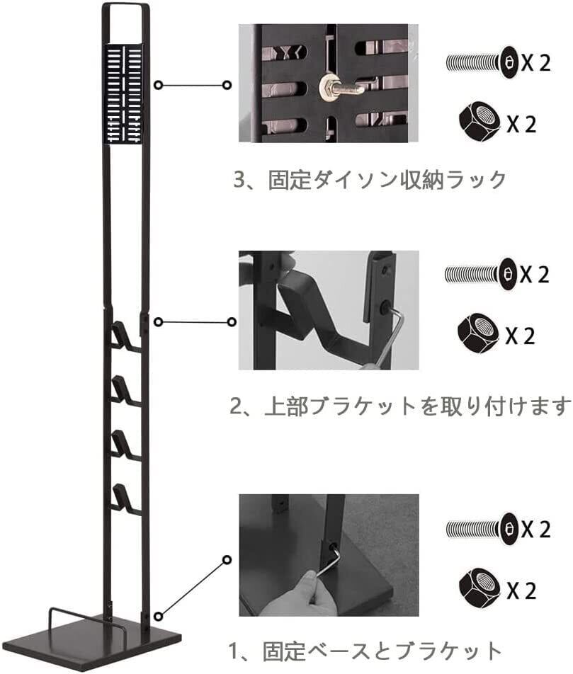 掃除機スタンド【製品のサイズ】:サイズ23*29*127 cm 製品の重量:3.5 Kg包装サイズ:68*23*7包装の重量:4.2 Kg包装の内訳:ベース*1、本体*2、ショックアブソーバー*4、セットスクリュー*8、充電ブラケット収納器*3、簡易ドライバー*1。【ご注意】※本商品は【スタンドのみの販売】です。ダイソン社製クリーナーや充電器、ブラケット等は付属しておりません。ご了承ください。