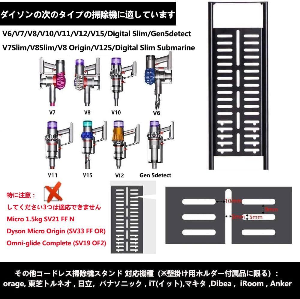 掃除機スタンド,【壁掛け掃除機】:コードレス掃除機スタンドは様々な壁掛け掃除機に対応しています。Dyson社サイクロン掃除機:DC35 / DC45 / DC58 / DC59 / DC61 / DC62 / DC74 、V6 / V7 / V7 Slim / V8 / V8 Slim / V10 / V11 / V12/ V12s / V15t/V15 Detect 、Digital Slim/Gen5 detect/Omni-glide Complete などの新モデルも使用に適している;ダイソンの他のモデル名 SV46 /SV30 /SV18/SV19 OF2/SV21/SV22/SV23。その他コードレス掃除機スタンド 対応機種(※壁掛け用ホルダー付属品に限る): orage, 東芝トルネオ , 日立,パナソニック , iT(イット),マキタ ,Dibea , iRoom , Anker