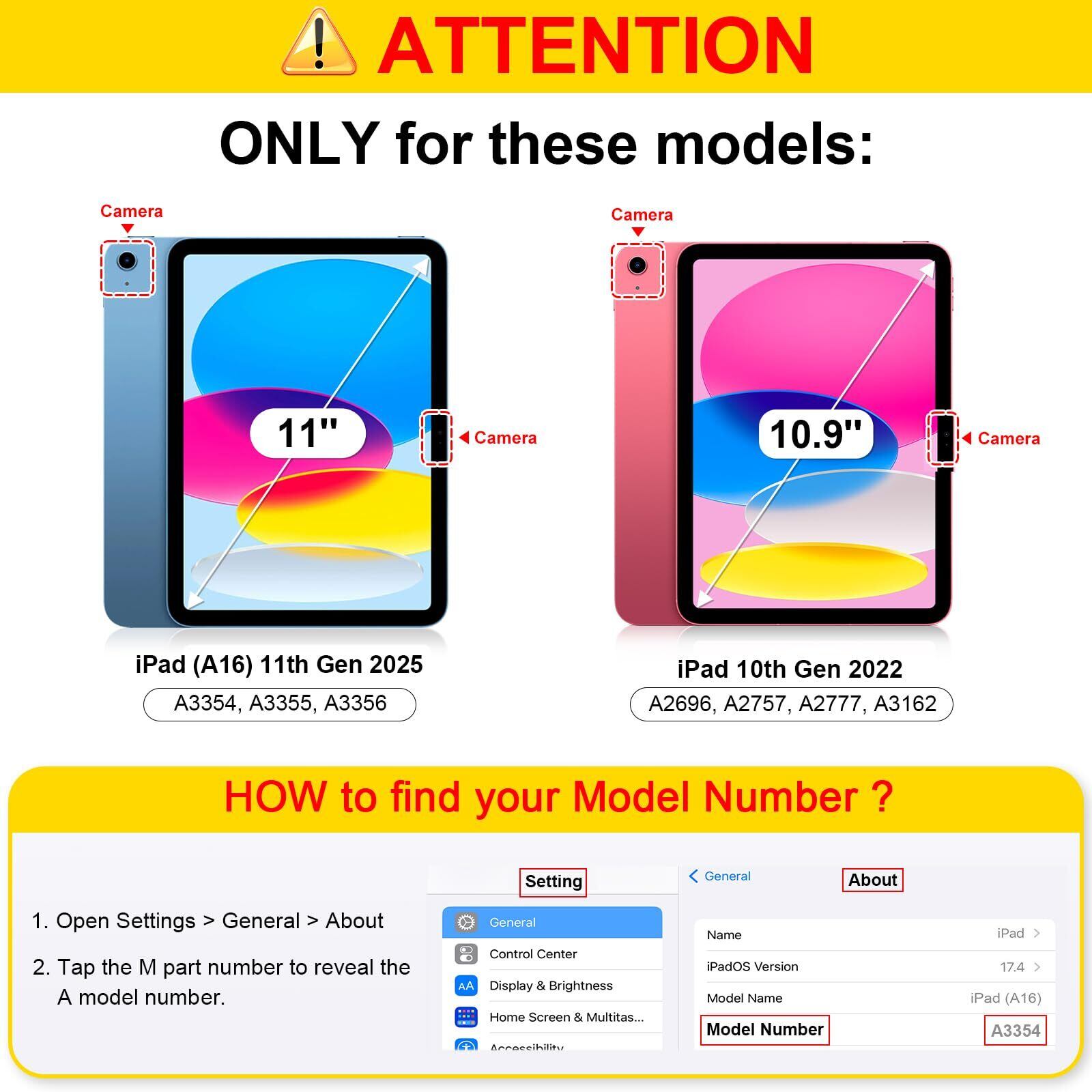 【対応機種】iPad 第11世代 (A16、2025) 11インチ(モデル番号:A3354 / A3355 / A3356) / 第10世代 (2022) 10.9インチ(モデル番号:A2696 / A2757 / A2777) 専用スマートケース、カバー。(ご注意:iPadの他のモデルには対応していません、ご注文の際に、お手元機種の背面にあるモデル番号を確認をお願い致します。)