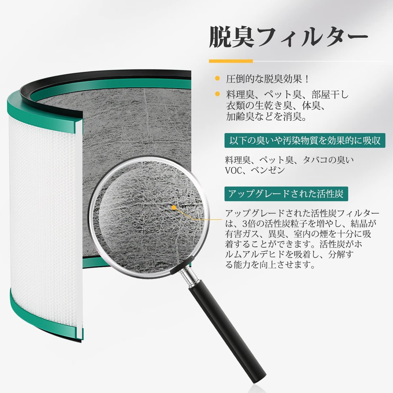 【材質】HEPAマイクログラスファイバーをプリーツ状に200回以上折った⾼密度のフィルターで、アップグレードされた活性炭。
