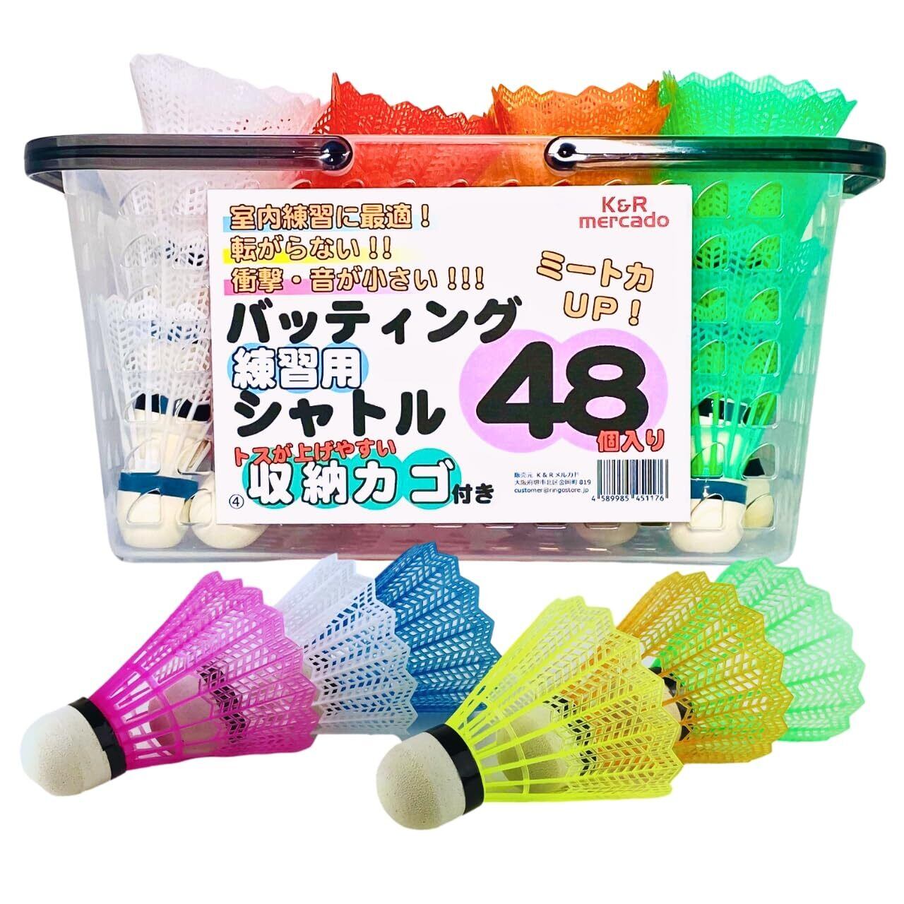 K&R mercado 野球 室内 練習 トスバッティング シャトル ( 羽 ) 48個 + 収納カゴ セット ランダム4色アソート