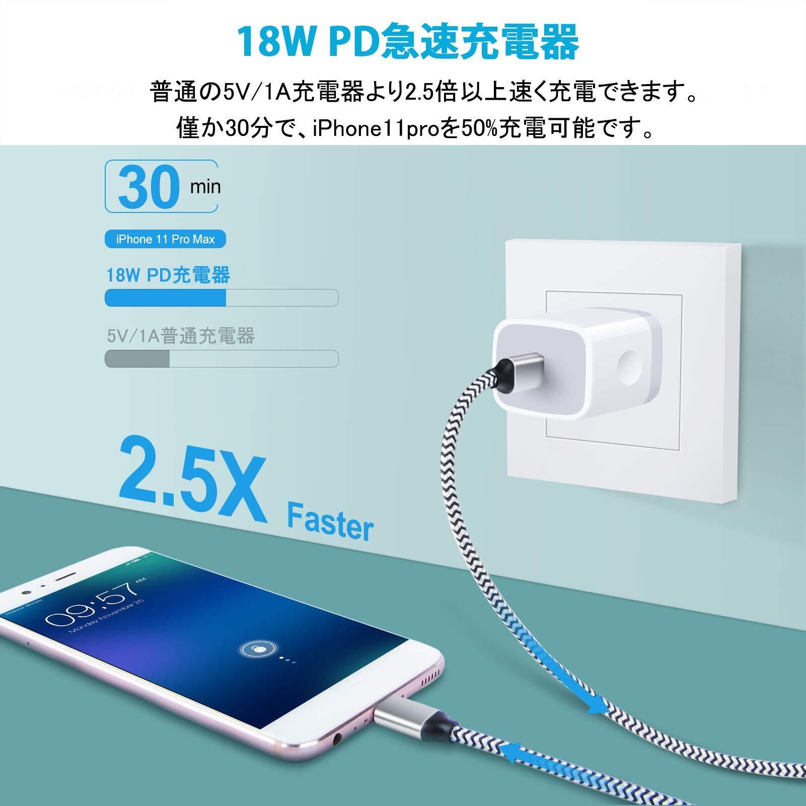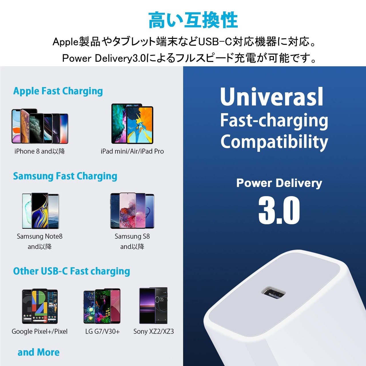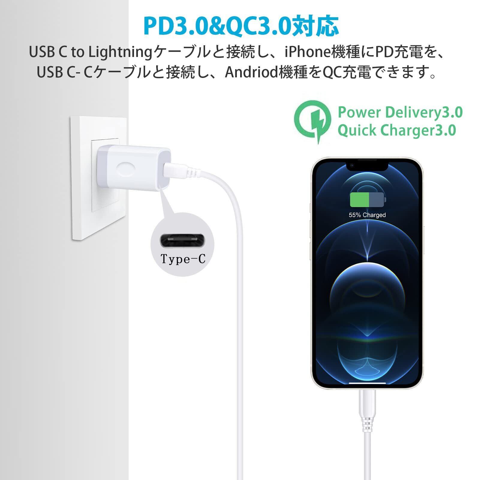 PD3.0 急速充電アダプター: Power Delivery 3.0の充電技術を採用して、Apple最新モデルPhone8を始め、アップル純正の電源アダプターより3.5倍速く充電を実現できる20W USB C 充電器です。Phone116へ僅か30分で50%までに充電できます。USB Power Deliveryとの互換性をさらに高めながら、Qualcomm Quick Chargeなどの充電規格にも対応し、より幅広い機器へのフルスピード充電が可能となりました。