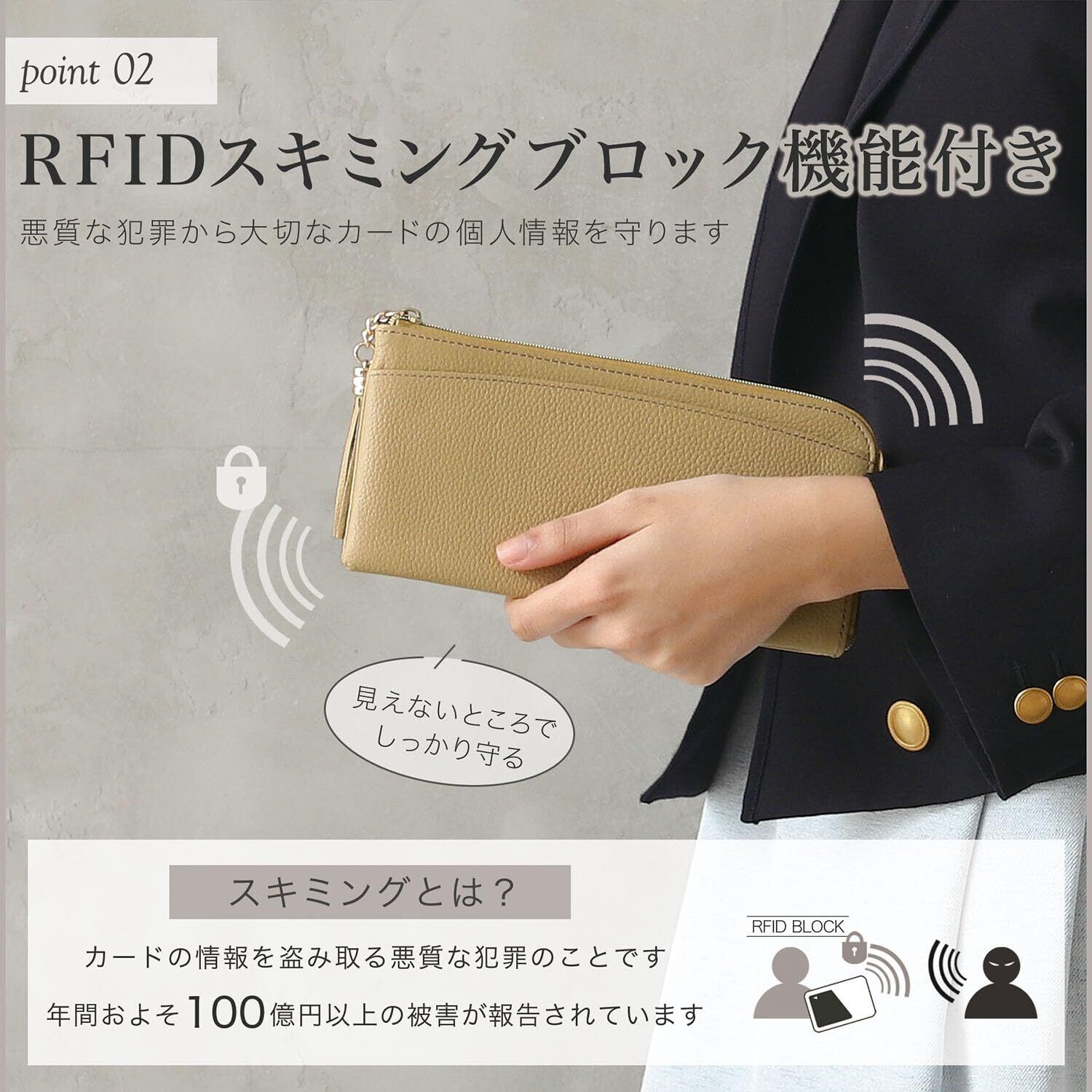 【 今の時代に欠かせないスキミング防止機能 】 近年急速にキャッシュレス化が進み、カードで支払いできるお店も増えてきて、カードでの支払いが主流になって来ました。 カードで簡単に支払いができる便利な世の中になった反面、スキミングという恐ろしい犯罪も増えて来ました。 スキミングとは、専用の機械を使って、クレジットカードやキャッシュカードなどの大切な情報を盗み取る犯罪です。 近づいただけで知らない間に大切なカード情報を盗み取られてしまう危険性があります。 そんな恐ろしいスキミングの被害からあなたを守るべく、スキミング防止機能を搭載しました。 特殊なフィルムを織り込むことで、外部からの電波をシャットアウトします。 カードをカードポケットに入れておくだけでスキミングの被害を防ぐことができます。大切なカード情報をしっかり守ります。