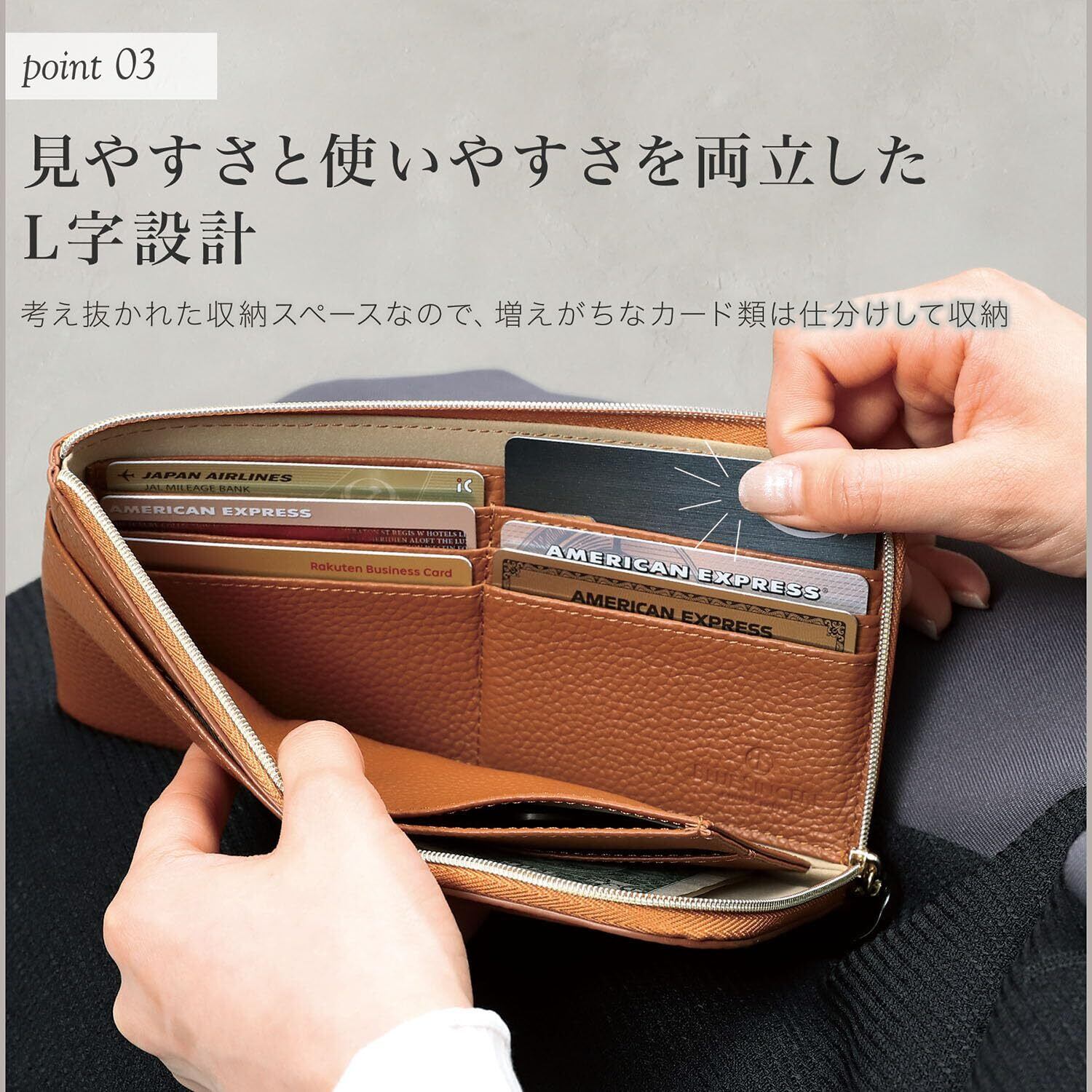 【 使いやすさを徹底追求 】 レジ前で財布を開ける時、もたついてしまって恥ずかしい思いしたことありませんか? 周りから注目されて恥ずかしいですよね。 BLUE SINCEREのⅬ字長財布ならそんな心配もありません。 Ⅼ字ファスナーは通常のラウンド長財布に比べて1工程少ないので開けやすさが圧倒的に違います。たったそれだけに感じるかもしれませんが1行程だけで明らかに開けやすくなります。 また、持ち手にタッセルが付いているので、サッと持ち手を持って開閉することもできます。 ファスナーにはスムーズな動きが持ち味の高品質ファスナーを採用しているので、更に開閉がラクにすることができます。 この使いやすさをぜひご体感下さい。