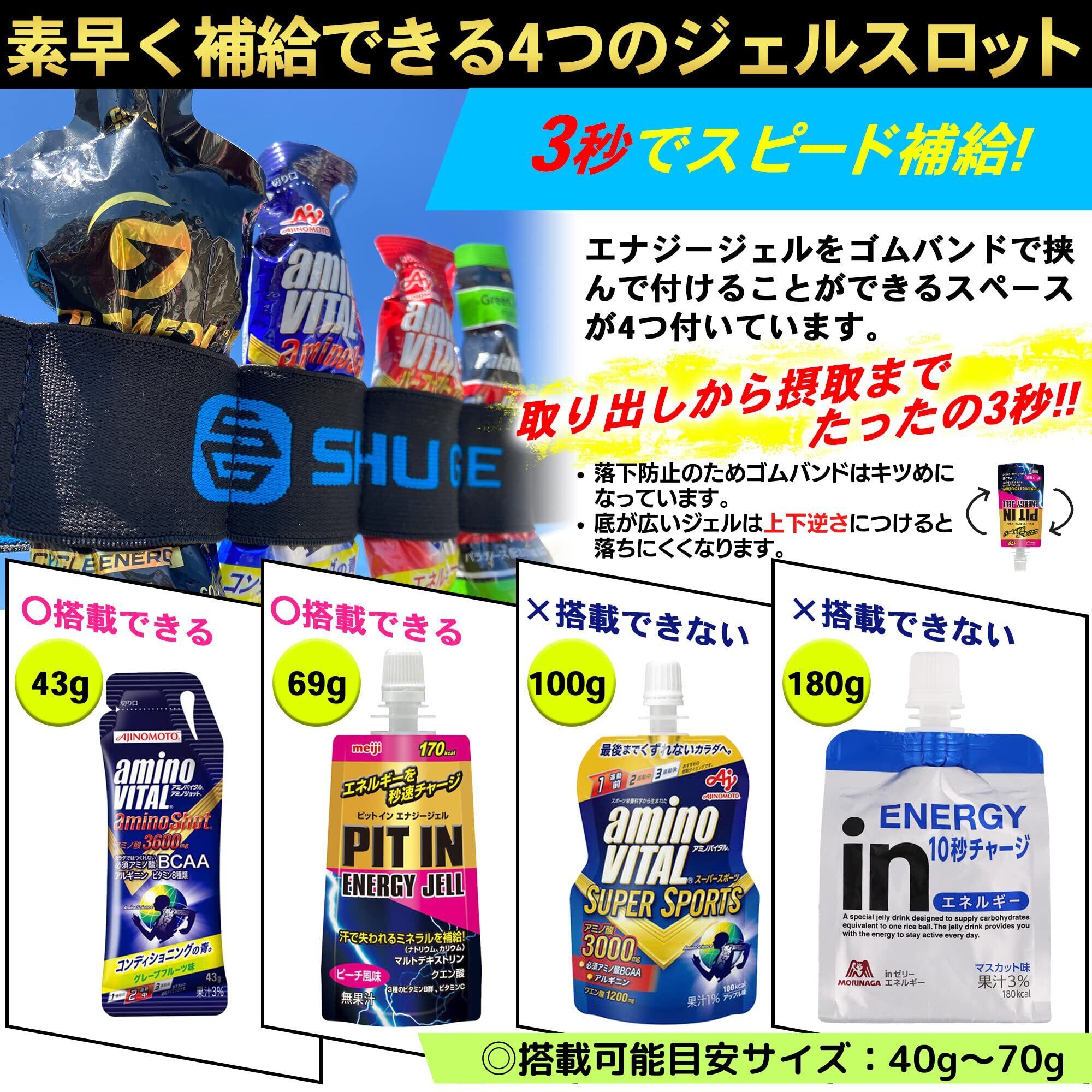 【走りを犠牲にしないジェルスロット】『取り出し〜摂取まで3秒』を目指した4ヶ所のジェル固定スペースを装備し、走りを犠牲にすることなくスピーディーな補給が可能です。※搭載可能ジェルの目安は40〜70g ※取り付けの際はジェルを上下逆さに入れてください
