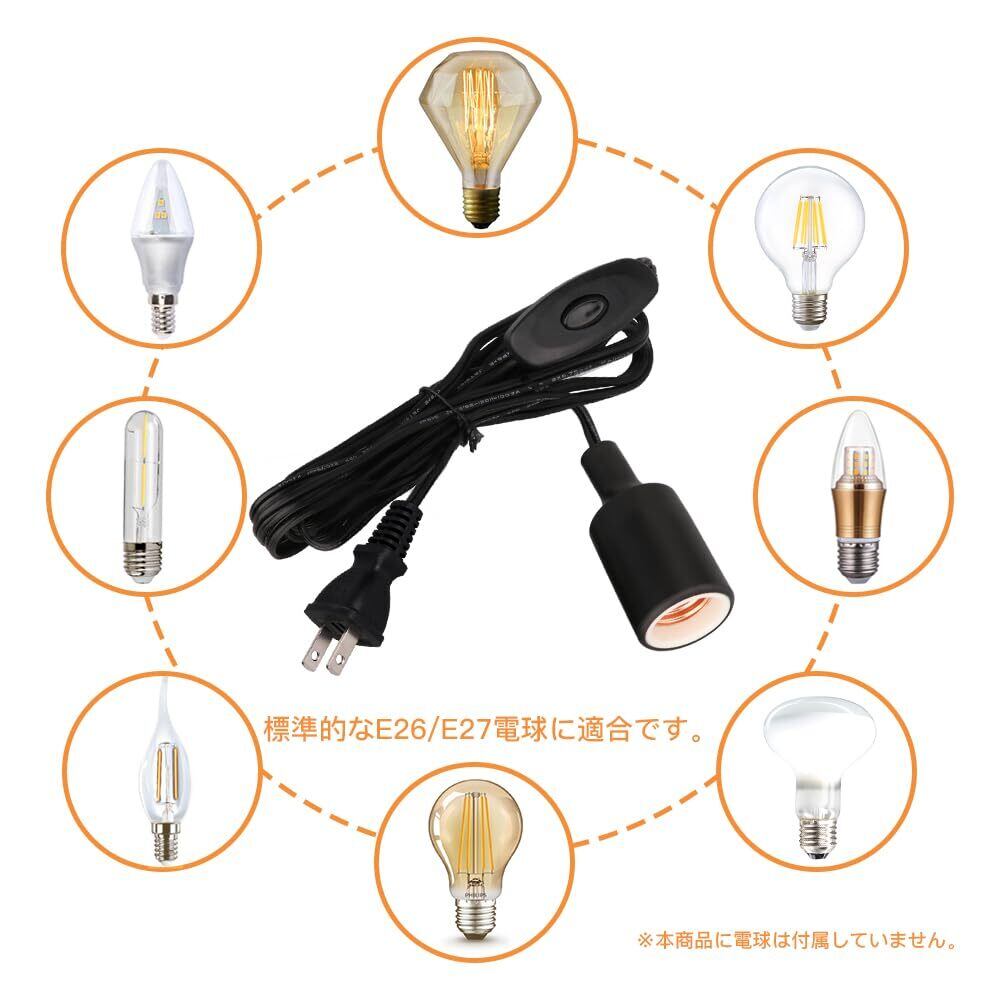 Zevnico コード付きソケット 電球ソケット コード長3m コンセント E26口金 ブラック ペンダントライト スイッチ付き 専用 LEDライトソケット プラグ付き ケーブル 吊り下げ 照明器具 (1個入, ブラック)