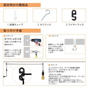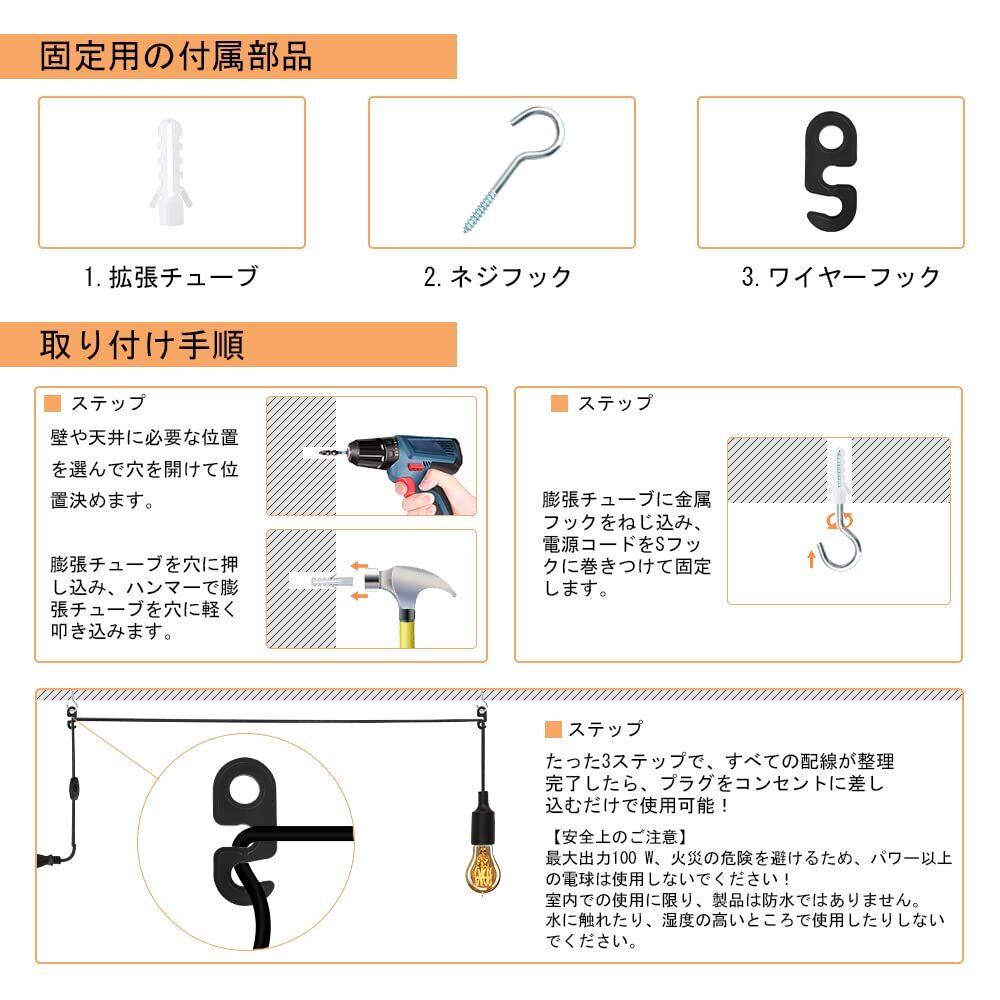 【簡単な取り付け】電球ソケットは、プラグアンドプレイのソケット式なので、電球を取り付けるだけで簡単に使用できます。交換の手間も減らせ、固定用の付属部品(膨張チューブ2本、ネジフック2本、コードフック2本)を提供しており、天井にぶら下げて使用するのに便利です。取り付け手順は、付属の取扱説明書に従って、10分間ほどで簡単に取り付けられるが完了します。とても便利です。