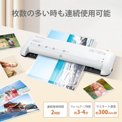 【ウォームアップ時間】:約3-4分【連続ラミネート時間】:2時間【対応フィルム】:80/100μm