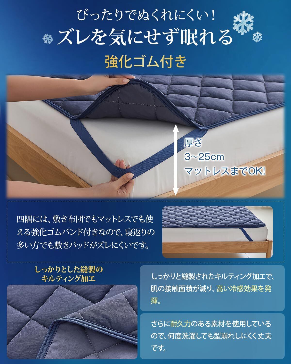 【強化ゴムバンド付き】四隅に強化ゴムを使用し、耐久性アップ。繰り返し装着しても伸びにくく、マットレスにしっかりフィットします。
