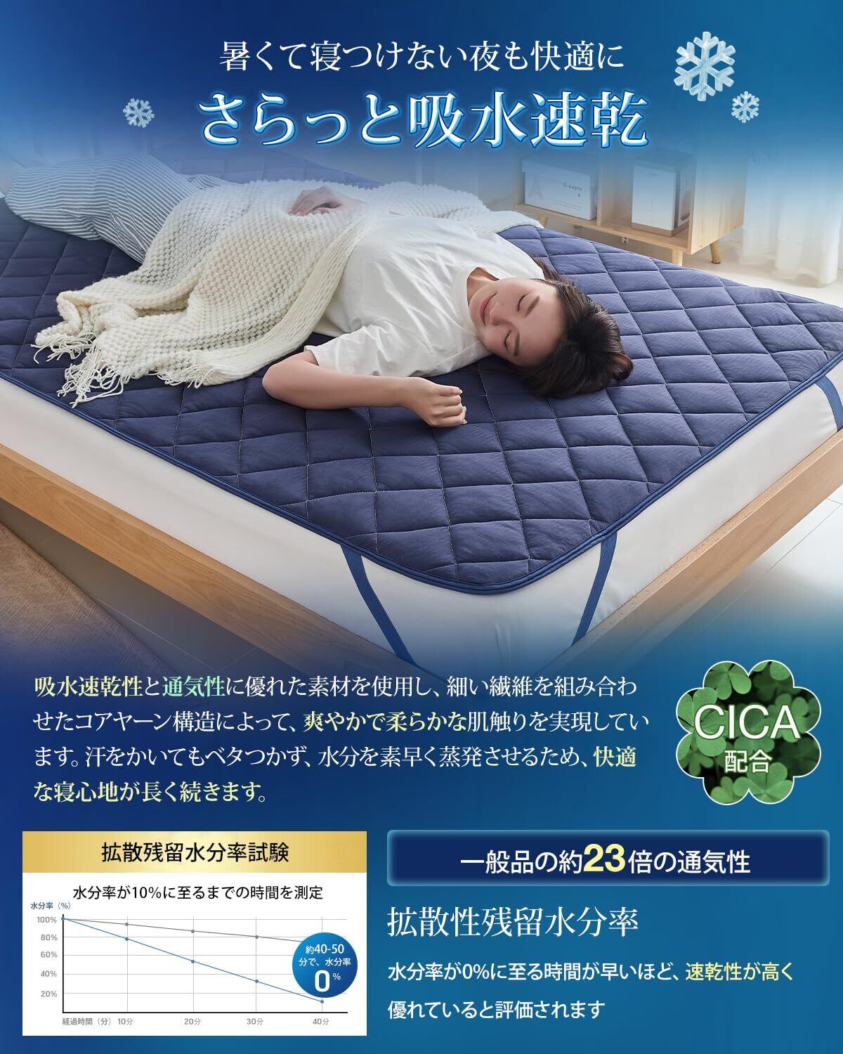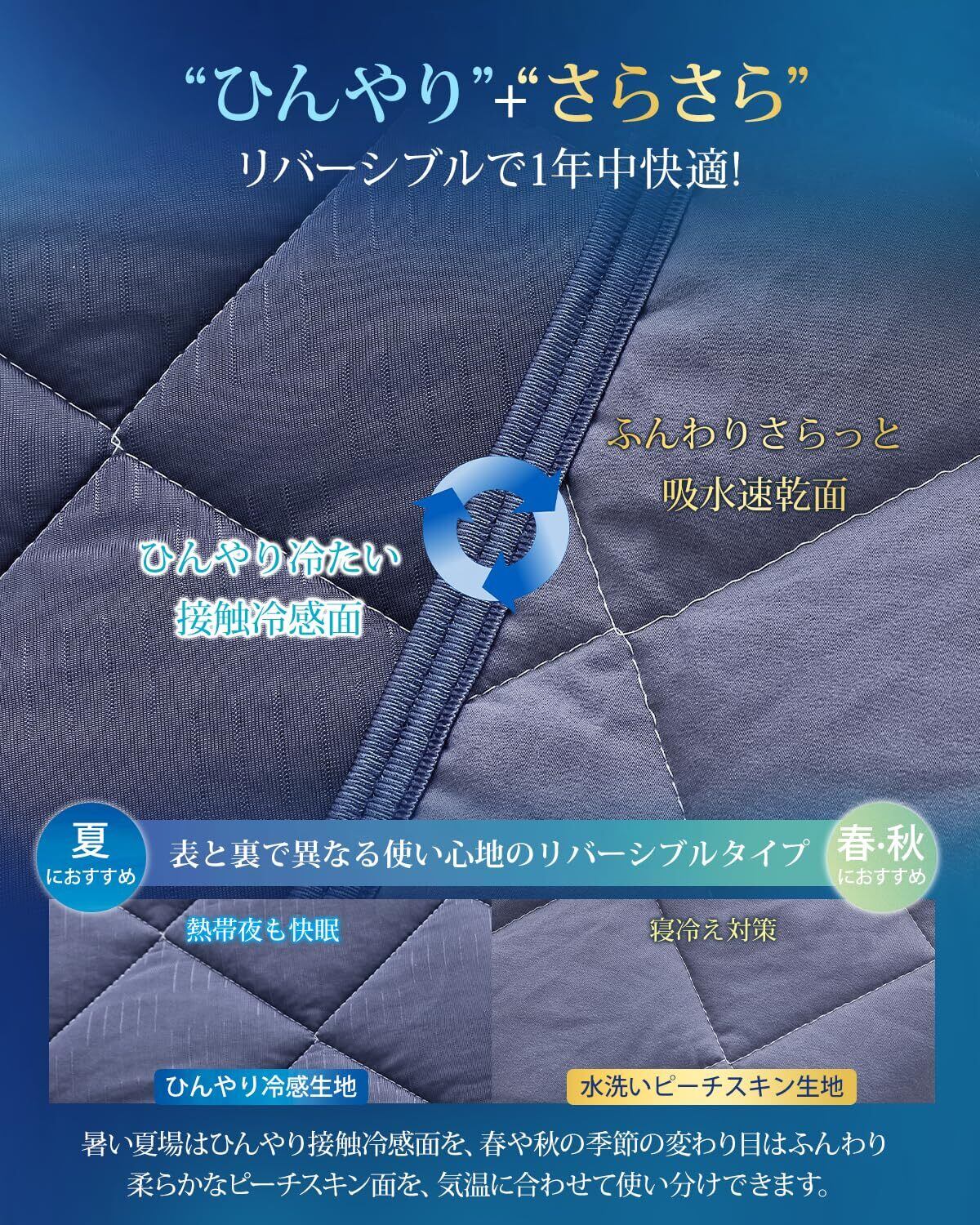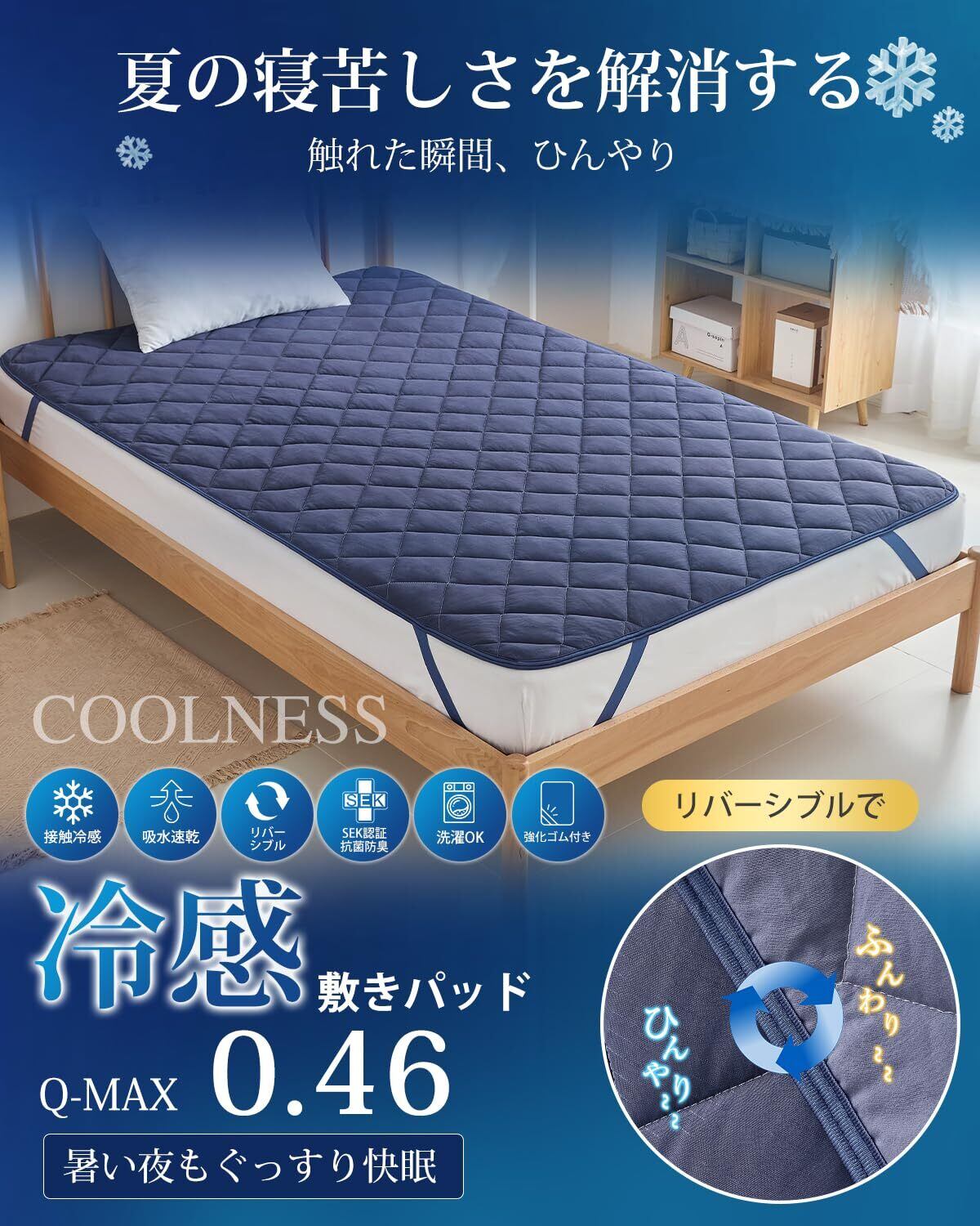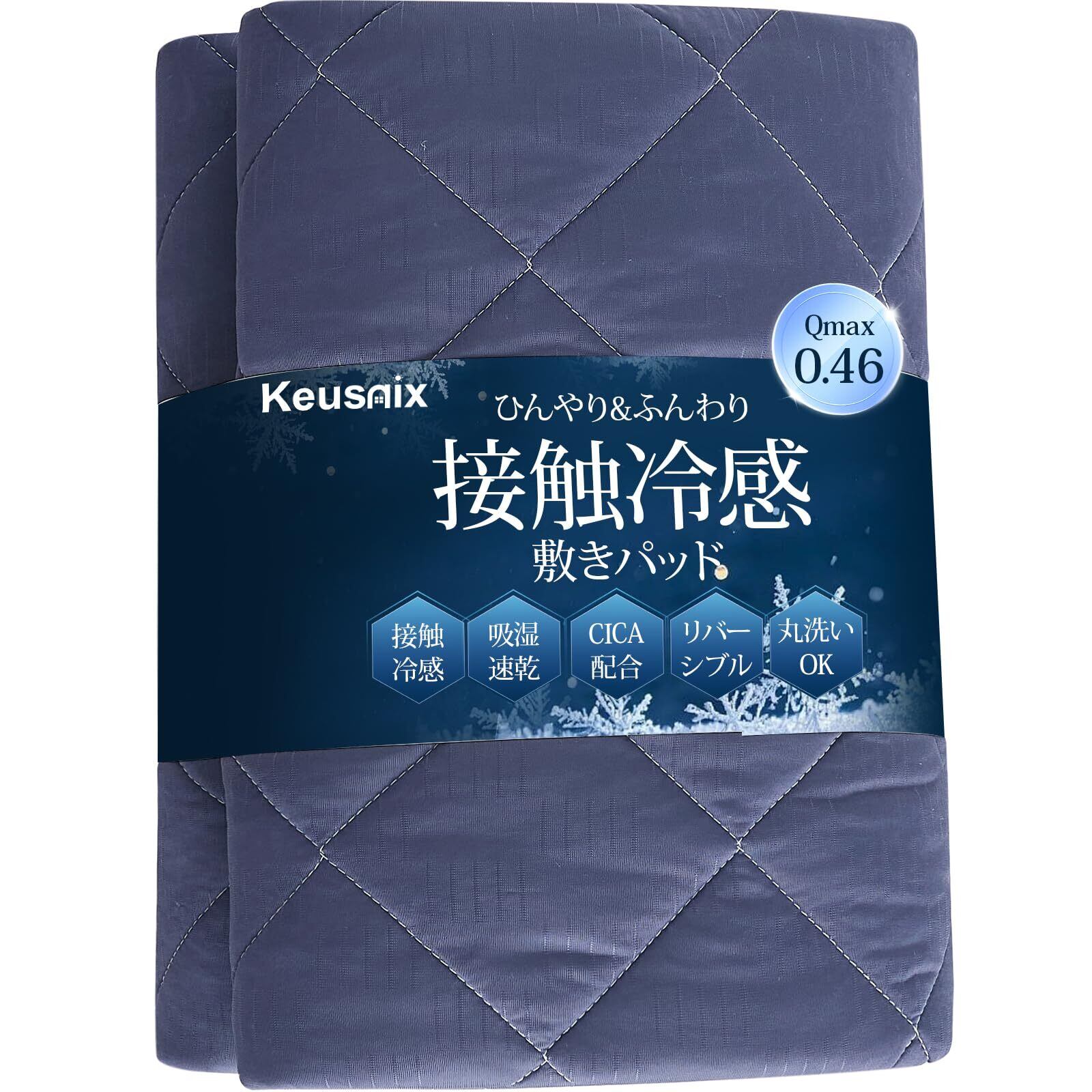 Keusnix 敷きパッド シングル 夏 冷感 Q-max0.46 リバーシブル【冷感表地&綿起毛裏地:両面使える】夏用 ひんやり しきぱっと 接触冷感 ベッドパッド SEK認証 防ダニ 抗菌防臭 冷感シーツ 洗える 吸湿速乾 通気性 熱帯夜対策 冷たい クールパッド 四隅ズレ防止ゴムバンド付き 涼感 100×200cm ネイビー