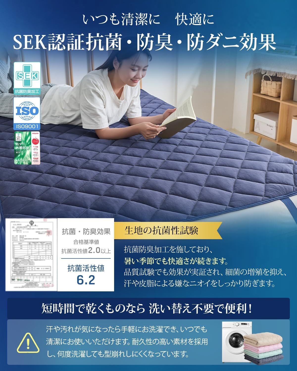 【ご家庭で丸洗いOK】丈夫な素材とキルティング加工で型崩れしにくく、中綿の偏りも防止。速乾性が高く毎日洗えて清潔をキープ。※洗濯時は必ず洗濯ネットをご使用ください。
