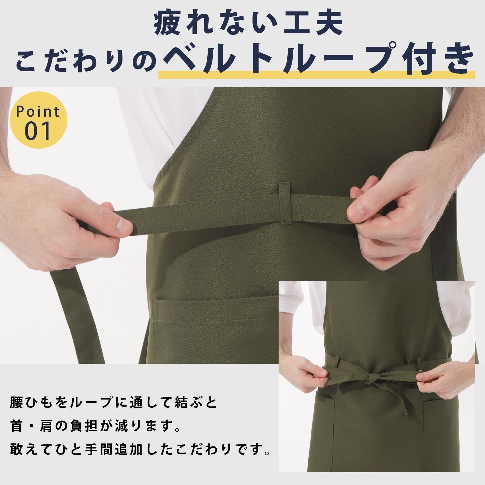【 ループ(ベルト通し)】:使いやすさへのこだわり。より使いやすくする為に、腰ひもを通すループ(ベルト通し)を付けました。ループを通して前結びすると、首掛けとして使用の際は首の負担を減らし、前掛けとして使用の際は着崩れを防ぎます。