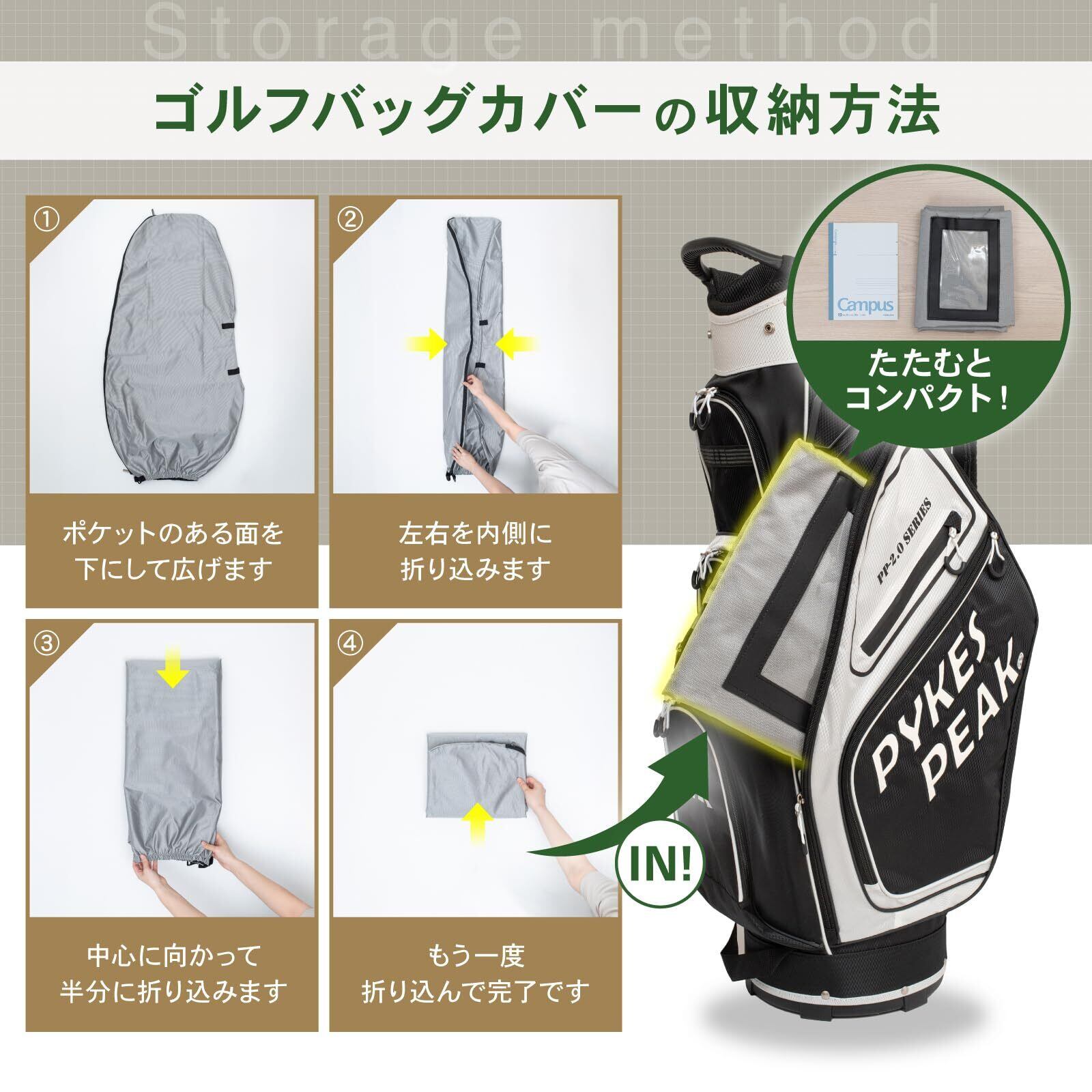 【コンパクトに収納できる】トラベルカバーの 収納時は、折りたたむと大学のノートサイズ(約B5サイズ)にまで小さくコンパクトになるので、ゴルフをプレイ中はキャディバッグの中や手荷物にも簡単に収納することができ、邪魔になることはありません!プレイ中の突然の雨にも取り出してすぐ取り付けができる簡単取り付け設計です!