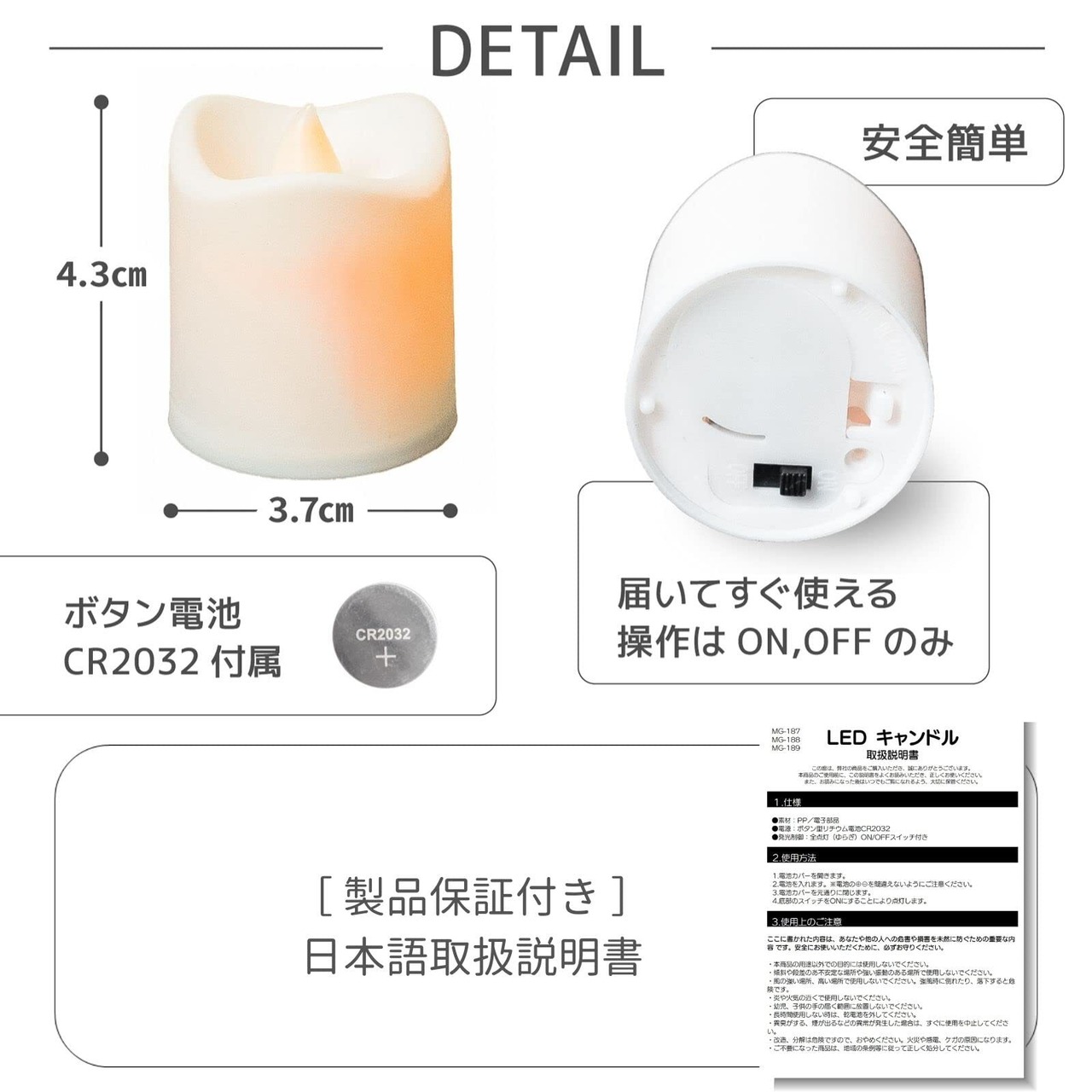【簡単な操作】:電池の交換とスイッチの開閉は簡単です。1.本体裏にある電源スイッチを入れる。2.使用後電源スイッチをOFF;電池付き、届いたらすぐ利用できます! 電池がなくなった場合は本体裏の電池収納部のフタをあけて、市販の ボタン電池(CR2032)を入れてください。