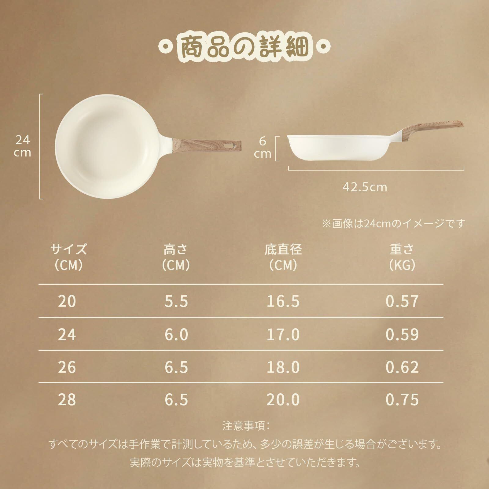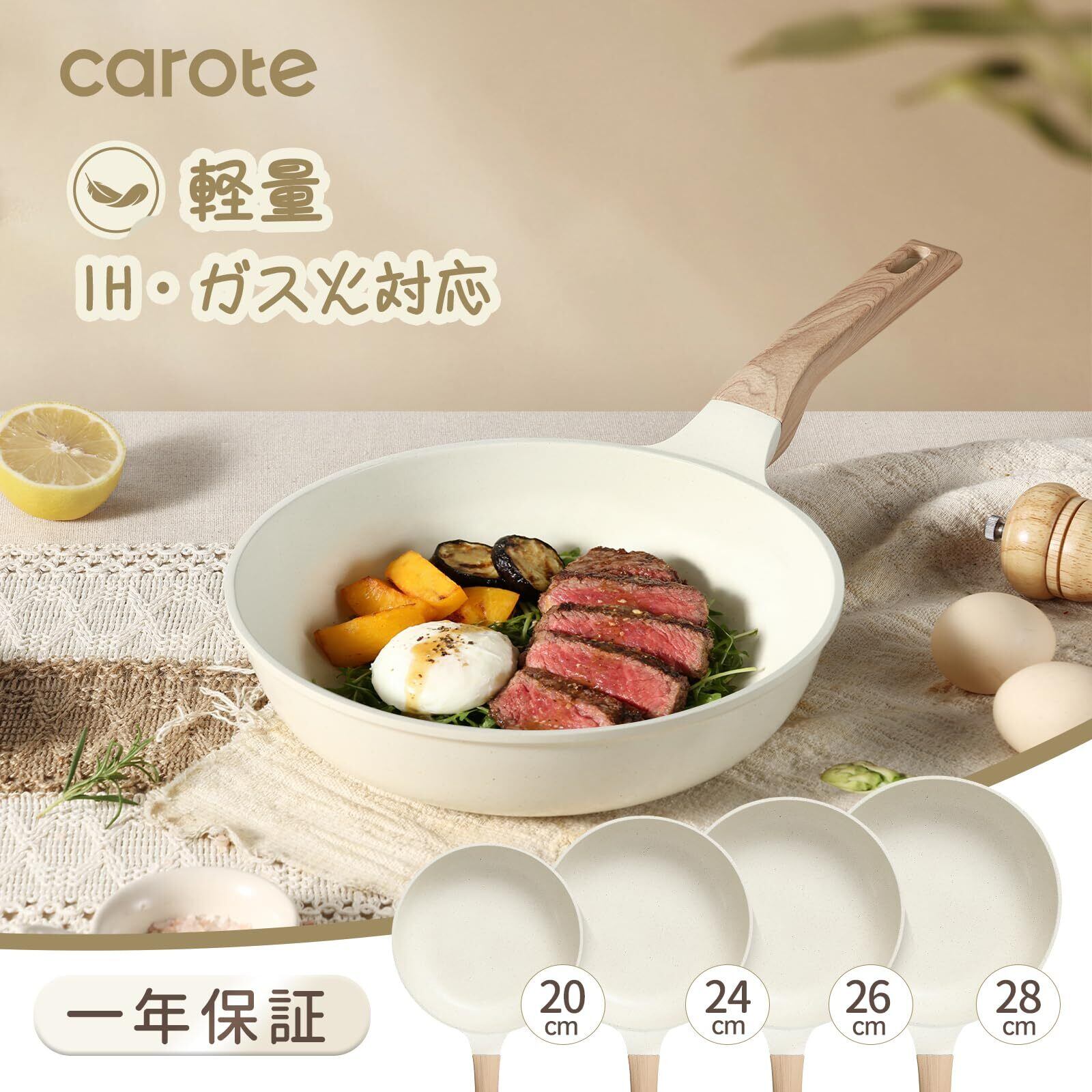 CAROTE カローテ フライパン 26cm IH·ガス火対応 PFOA PFOS フリー 5層構造 超軽量 深型設計 マーブルコート こびりつかない 洗いやすい オール熱源対応 1年保証 「アイスクリーム」シリーズ ベージュ