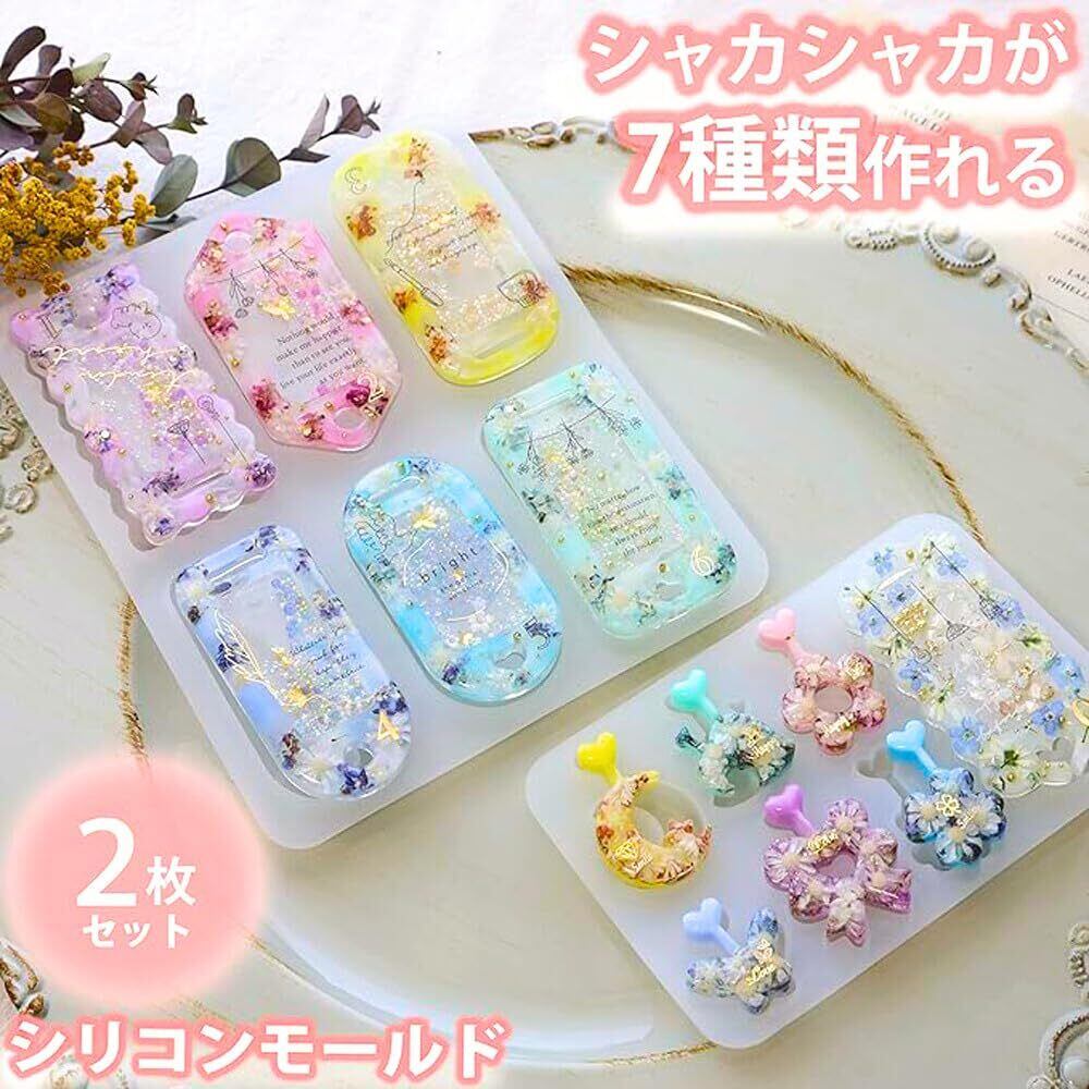 【商品について】 シャカシャカのネームタグが作れるシリコンモールドのセットです。7種類のかわいい形が作れる2枚セットです。パズルのように合体できるかわいいアイテムも付けられるセットも作れます 穴あけ作業が不要な便利な穴あきタイプです。高品質な半透明のシリコンモールドです。丈夫で柔らかく取り出しやすく、初心者の方でも簡単に取り外せます。反転の仕上がりになります。初めてお作りになる方は、youtubeで「シャカシャカ、ネームタグ 作り方」で検索してご覧ください。 UVレジン、エポキシ樹脂、樹脂粘土などにご利用いただけます。