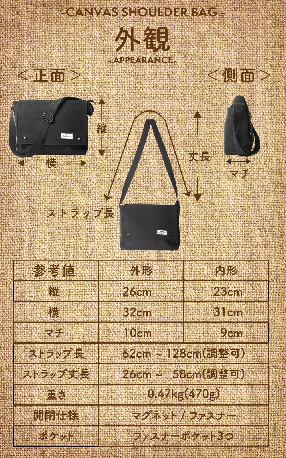 【素材】コットンキャンバス(綿・帆布) 裏地:ポリエステル 自然素材のコットンキャンバスは厚手の質感と手触りが心地良いショルダーバッグ。伝統的な配達カバンの原型を残し、ザックリと使い易いメッセンジャーバッグ風に仕上げています。斜め掛けバッグとしての使用をお薦めします。
