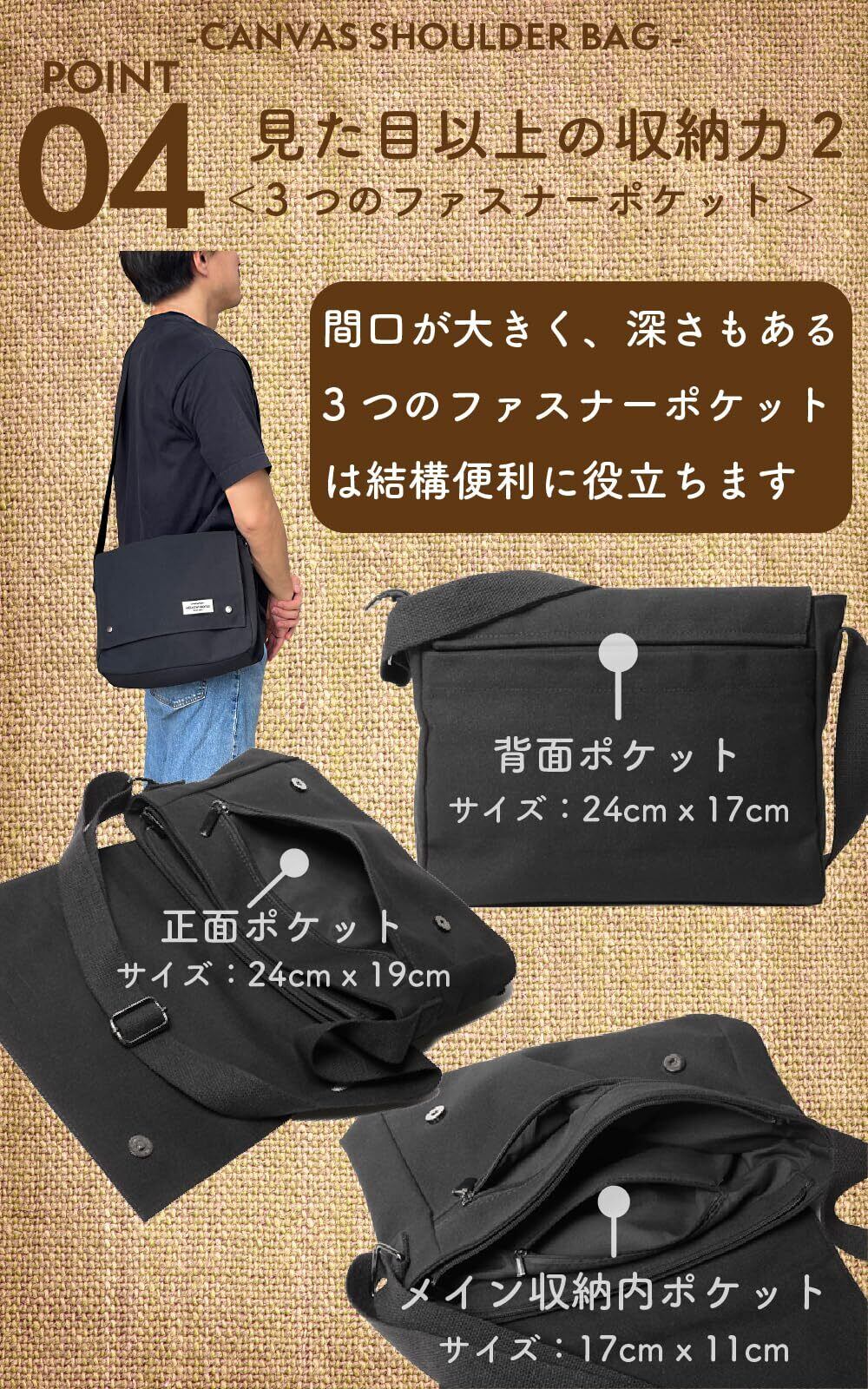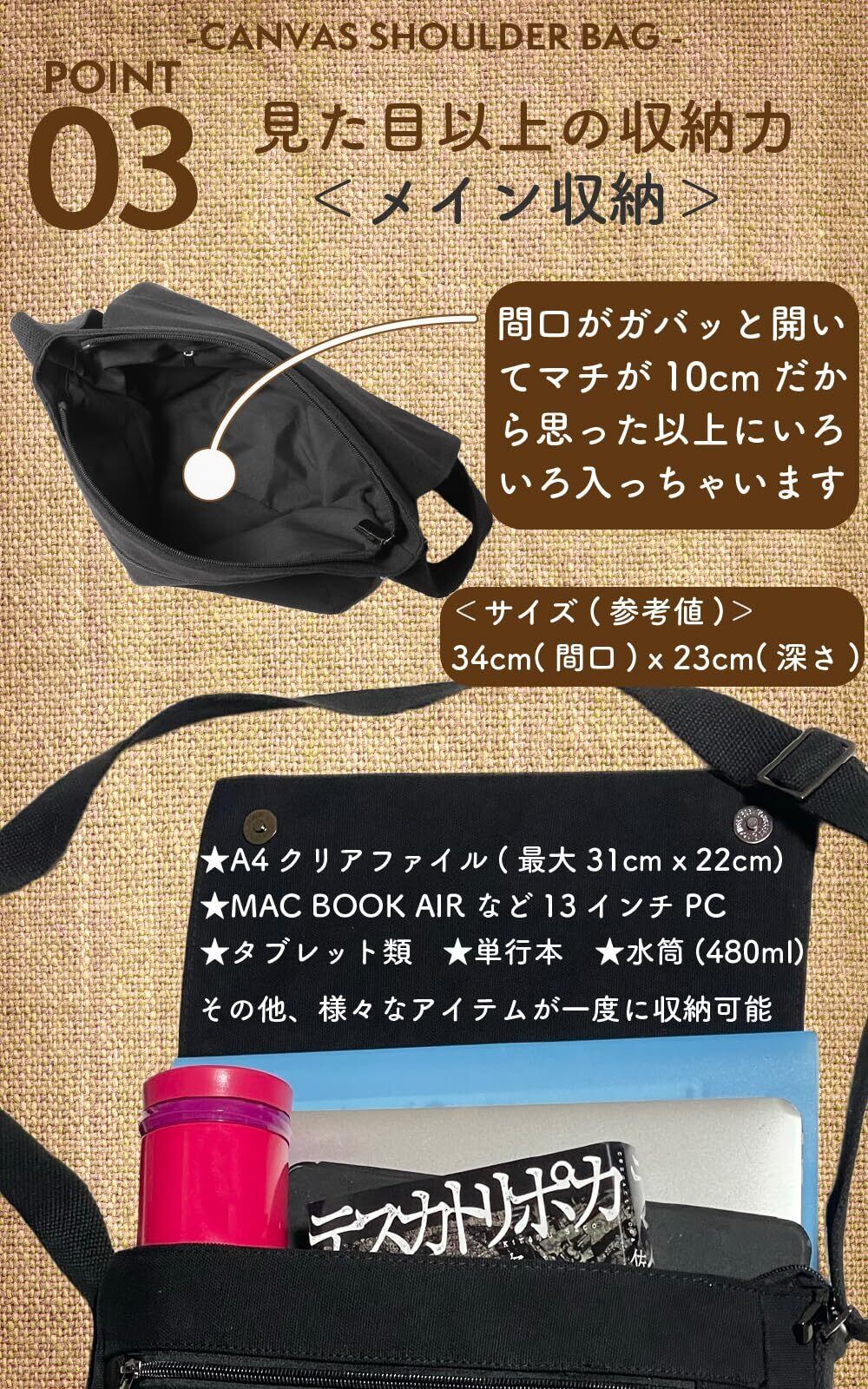 【見た目以上の収納】タブレット・13インチPC・A4書類・500mlペットボトル他、収納可能。(PC用の保護パッドはございません)マチが10cmなので、ラフに色々入るショルダーバッグ。メンズに限らず、女性にも使い易い肩掛けバッグです